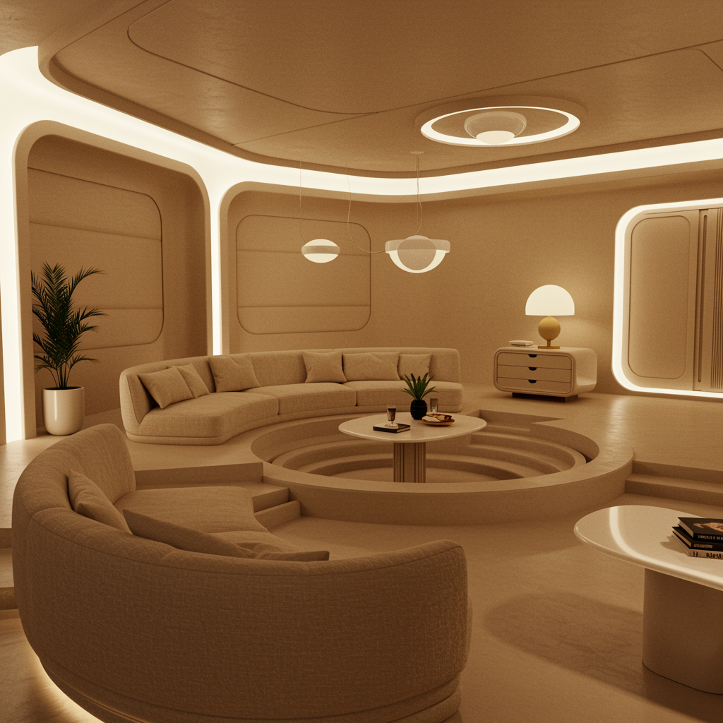 Sunken living room conversation pit with a retrofuturistic 70s vibe, featuring an imaginary 3D dreamy architecture render in ultra-high resolution. The interior design boasts a warm, neutral beige color scheme with subtle hints of earth tones. Smooth, curved furniture pieces and soft textured fabrics create an inviting atmosphere, while elegant, futuristic lighting elements cast a gentle glow. The space seamlessly blends nostalgia with forward-thinking design, offering a cozy and sophisticated setting for social gatherings.