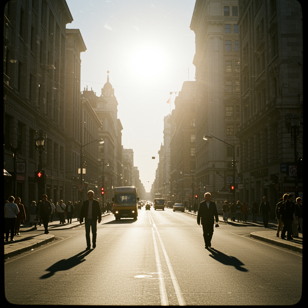Sunlit urban landscape captured on vintage Kodak film, bustling city streets alive with the vibrant energy of pedestrians and traffic, warm daylight casting soft shadows, hinting at the timeless essence of everyday life.