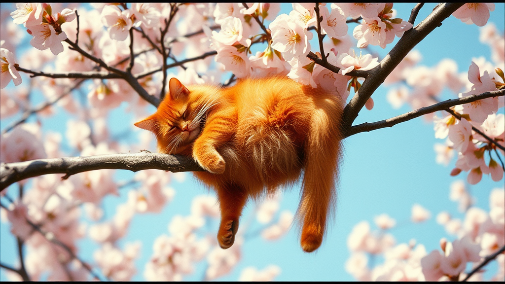 Sunny afternoon captured in a Kodak disposable camera photo of a vibrant red, fluffy cat snoozing peacefully on a blossoming tree branch, with its hind legs playfully dangling in mid-air, surrounded by soft, cinematic lighting that filters through the petals, casting gentle shadows and enhancing the tranquility of the scene.