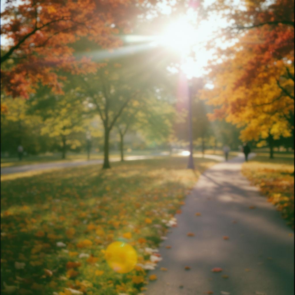 Sunny Autumn Park Scene, soft focus, gentle Film Grain, shot on 35mm, Kodak Portra feel, subtle Lens Flare, Rich Warm Tones, bright and inviting atmosphere --aspect 4:5.