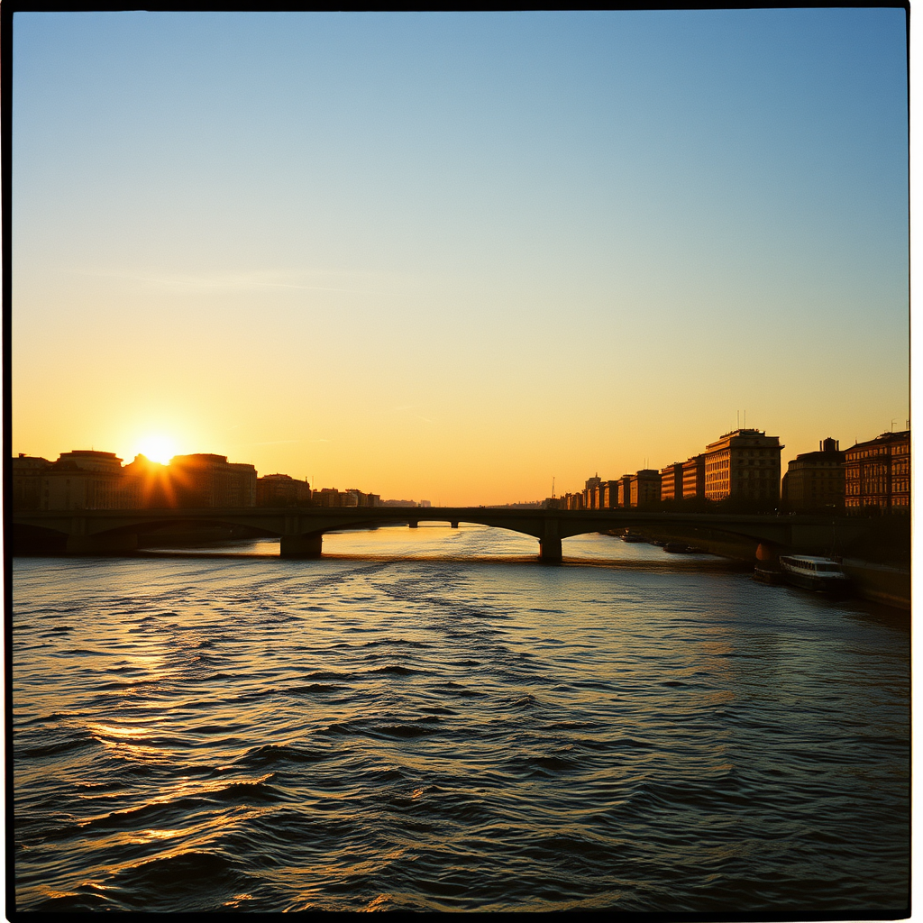 Sunset over a city river captured on warm-toned film, where shimmering reflections dance across the water's gentle current, with bridges and urban architecture framing the serene scene.