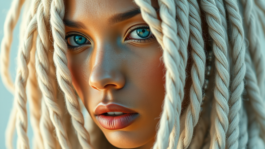 Super close-up of a stunning rasta girl with white dreadlocks, a fusion of steampunk and cyberpunk aesthetics, featuring a cyborg theme under soft volumetric lighting. Captured in realistic detail with a low contrast look reminiscent of Kodak Portra 400 film, in ultra-high definition 8k resolution. Artistic elements include 3D influences, abstract art, surrealist touches, and conceptual graphics. The composition blends aspects of drawing, collage, and black-and-white photography, maintaining a tastefully artistic nude portrayal.
