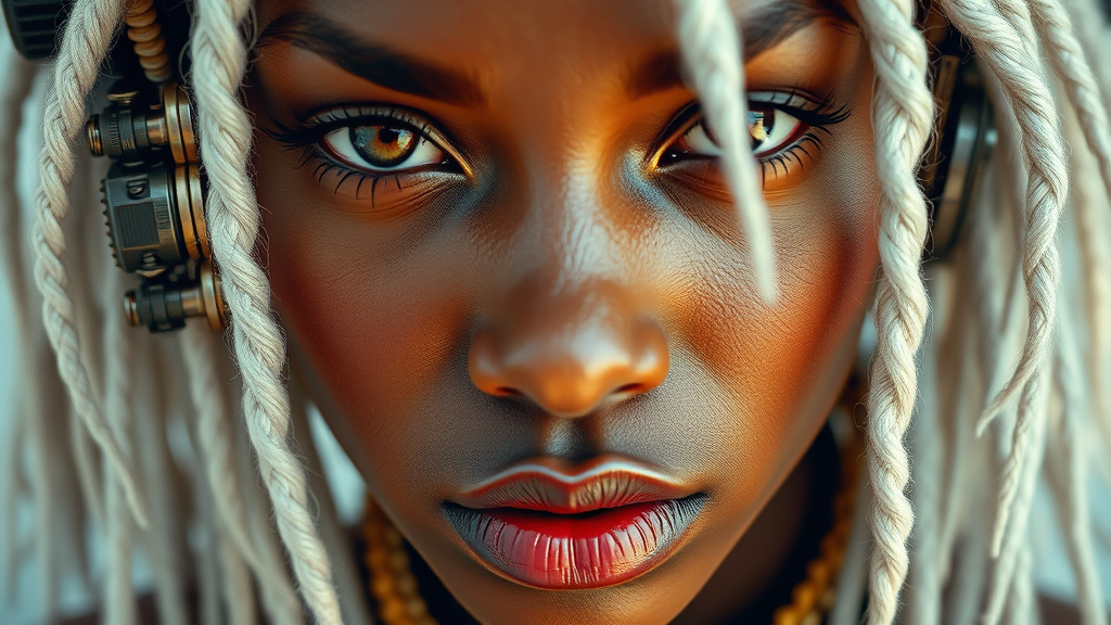 Super close up of a stunning rasta woman with striking white hair, blended with steampunk and cyberpunk aesthetics, featuring cyborg elements and bathed in soft volumetric lighting. The image is highly detailed, mimicking real-life photography with low contrast, reminiscent of Kodak Portra 400 film, rendered in ultra-high-definition 8k. The artwork fuses 3D elements with abstract art, surrealist painting, and conceptual graphics, mixing vivid color and monochrome techniques in a creative collage. The composition includes nods to both the elegance of letter art and the raw edge of nude expression, blending realism with the fantastical in an innovative and evocative portrait.