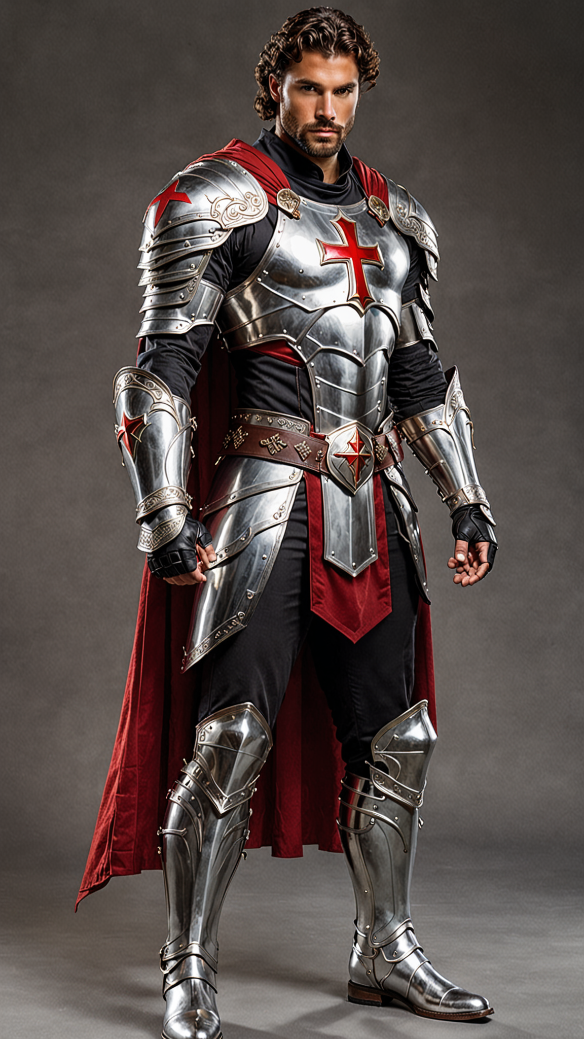 Super-hero , Christian mystic, modern-day Knight/warrior. He can see dark forces that most people don't, and he has the power and might to fight against them! He can do everything a wizard does, but it's his faith in God that empowers him. He is invulnerable to most harm, and he carries a long golden glaive with a huge shining white gem. This gem shines with holy light and drives away shadows and demons, or destroy them if needed. It also has a sharp tip that he can use as a weapon like a spear. Tall, strong, muscular, wide shouldered, broad backed, narrow waist, sinewy, hairy chest and legs. Caucasian male of Mediterranean descent, short curly black hair cut short on the sides and back. He wears a thick silver circlet around his head. Strong brow and jaw, intense Hazel eyes. Full well-trimmed beard and mustache. Shiny silver pauldrons on shoulders, shiny silver armor- chestplate and abs, a Scarlet red Cross on the chestplate, a Star-of-Bethlahem in white crystal embedded within the Cross. Scarlet red pants with shiny silver thigh and shin guards on the legs, metallic silver boots to complete the armor. Long Scarlet wizard's cape with thick silver trim around the edges, Christian symbols of protection embedded within the silver trim. His arms are bare, but he does wear silver gloves with shiny red bracers on his arms. Full body pose, arm with glaive raised in defiance, hair under his arm visible and thick.