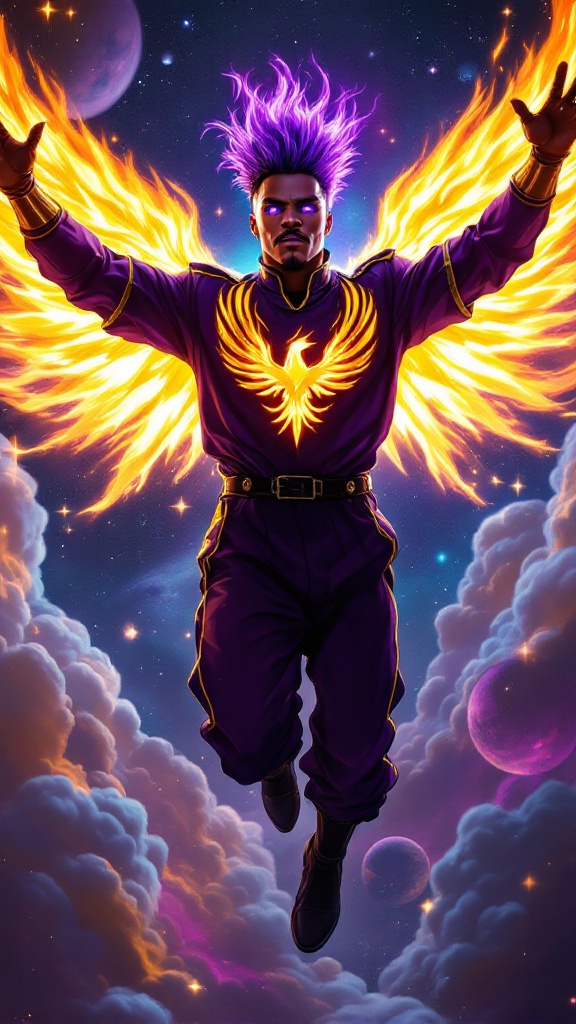 Super-hero, cosmic being, space entity. Tall, muscular, African-American male. Wavy fade Mohawk hairstyle, short on sides and back, longer on top, front hair hangs over one eye but spiking upwards. Hair is black, but appears to be on fire. Luminous glowing Violet-purple eyes, eyeliner around eyes. Soul patch under bottom lip, thin handlebar mustache. Loose fitting Violet jumpsuit with yellow-gold piping up the sides and down the sleeves, long sleeves. Yellow gold firebird/phoenix symbol with wings spread on the front the uniform. Black leather fingerless gloves, black leather belt with gold grommets wrapped around waist. Loose fitting baggy tapered pants with pleats down the front. Ultra black suede slouchy boots mid calf, black straps with gold grommets around them. Arms up and out, flying. Huge bright yellow-gold flaming wings emerging from arms, Violet eyes lit up like stars. Full body pose, flying past galaxies, gas clouds and planets.