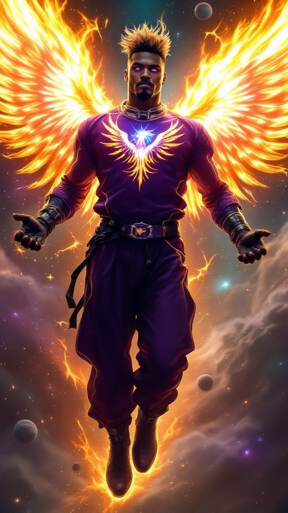 Super-hero, cosmic being, space entity. Tall, muscular, African-American male. Wavy fade Mohawk hairstyle, short on sides and back, longer on top, front hair hangs over one eye but spiking upwards. Hair is black, but appears to be on fire. Luminous glowing Violet-purple eyes, eyeliner around eyes. Soul patch under bottom lip, thin handlebar mustache. Loose fitting Violet jumpsuit with yellow-gold piping up the sides and down the sleeves, long sleeves. Yellow gold firebird/phoenix symbol with wings spread on the front the uniform. Black leather fingerless gloves, black leather belt with gold grommets wrapped around waist. Loose fitting baggy tapered pants with pleats down the front. Ultra black suede slouchy boots mid calf, black straps with gold grommets around them. Arms up and out, flying. Huge bright yellow-gold flaming wings emerging from arms, Violet eyes lit up like stars. Full body pose, flying past galaxies, gas clouds and planets.