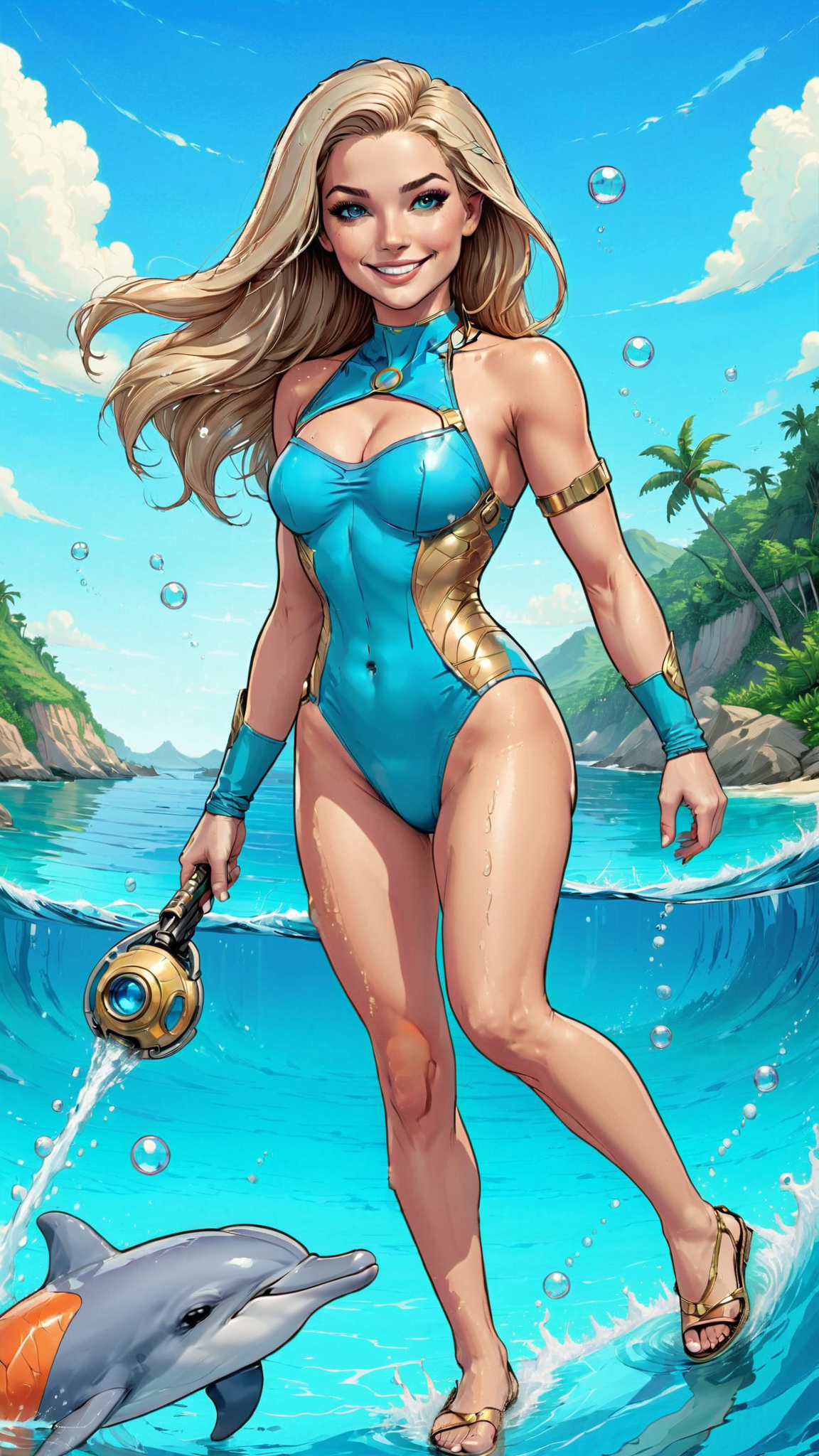 Super-hero, fantasy. Once, she was a dolphin in the ocean that magically became a beautiful woman, then a super-hero! She can pull water vapor from the air to create water streams she can blast her enemies with. She can also use sonar to send out signals and increase her vision underwater. She also has a high pitched squeak that can do sonic damage and mind damage to her targets. She also has an aura of bubbles-- invisible on land, but very visible beneath the waves! She can also swim at very high speeds. Tall, caucasian female with aqua colored eyes and long pale blonde hair, all one length and combed back. Pretty face, usually smiling. She wears a one-piece aqua-blue swimsuit that goes up to the neck and clasp in the back. There is a waves graphic printed on the front of the swimsuit. She wears short gold gauntlets on her arms, and a metallic gold belt around her waist; it contains tiny tools that she can use on her adventures. She wears a pair of aqua-blue slide on shoes-- they have no heels and only come up to her ankles, allowing her freedom of movement. She is a happy and adventurous person, so she's always smiling. Full body pose, probably on the beach or swimming. There are always dolphins nearby.