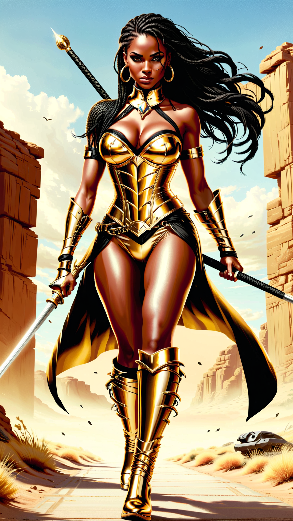 super-hero. female, African woman. Tall, slim but strong and curvy, sinewy. Athletic, warrior, fighter. Beautiful face, high cheekbones, dark brown skin, smooth and luxurious. Large, dark eyes, black and liquid. Long black braids that are usually tied back with a golden cord/hair holder. She wears a golden sandy colored bodysuit, the sides cut out of the legs and arms and laced with golden straps. Around her waist is a metallic gold corset and belt, along with small shoulder guards of the same color. There are metallic gold bracers on her arms and a gold metal circlet around her head. Over her shoulder is a short yellow-gold cape with a cheetah print. Her knee-high boots are also yellow-gold with cheetah print. Her boots have very low heels and are made for running across the Serengeti Plains. She runs as fast as a cheetah. She carries a strong, wooden bo staff as a weapon. She carries herself like the African princess that she is, but she is free spirited. Full body pose, fighting stance with bo staff.