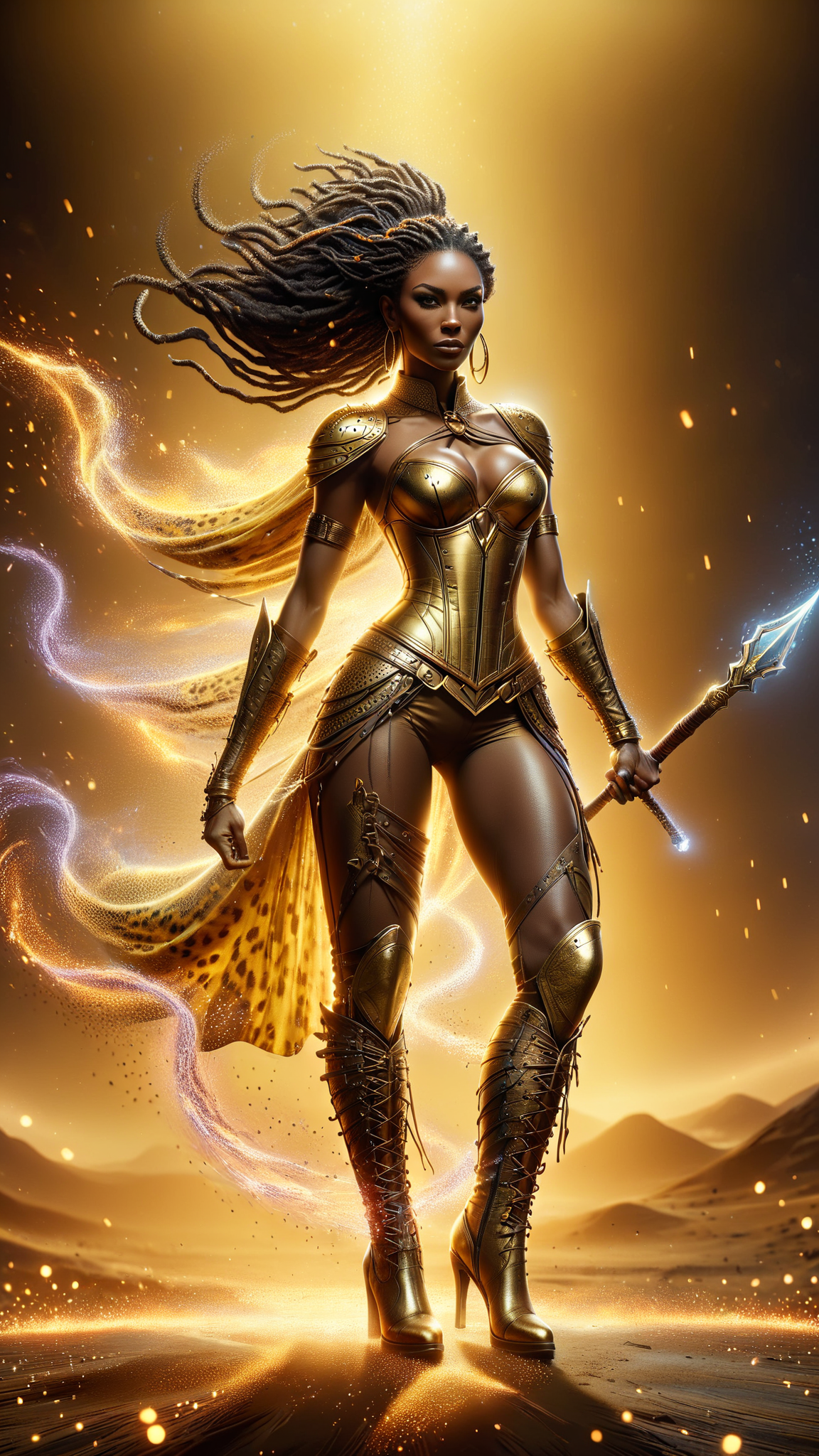 super-hero. female, African woman. Tall, slim but strong and curvy, sinewy. Athletic, warrior, fighter. Beautiful face, high cheekbones, dark brown skin, smooth and luxurious. Large, dark eyes, black and liquid. Long black braids that are usually tied back with a golden cord/hair holder. She wears a golden sandy colored bodysuit, the sides cut out of the legs and arms and laced with golden straps. Around her waist is a metallic gold corset and belt, along with small shoulder guards of the same color. There are metallic gold bracers on her arms and a gold metal circlet around her head. Over her shoulder is a short yellow-gold cape with a cheetah print. Her knee-high boots are also yellow-gold with cheetah print. Her boots have very low heels and are made for running across the Serengeti Plains. She runs as fast as a cheetah. She carries a strong, wooden bo staff as a weapon. She carries herself like the African princess that she is, but she is free spirited. Full body pose, fighting stance with bo staff.