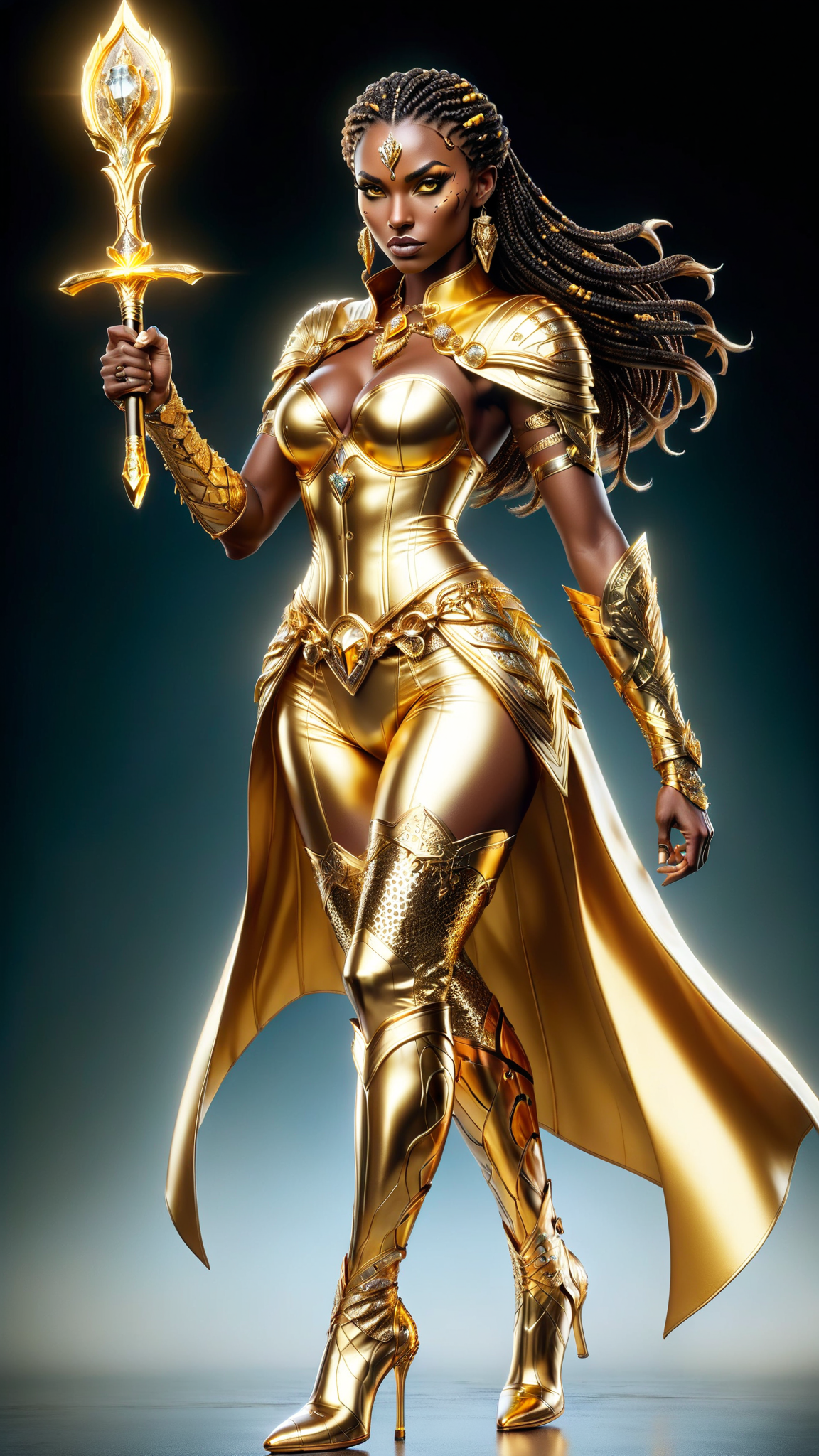 super-hero. female, African woman. Tall, slim but strong and curvy, sinewy. Athletic, warrior, fighter. Beautiful face, high cheekbones, dark brown skin, smooth and luxurious. Large, dark eyes, black and liquid. Long black braids that are usually tied back with a golden cord/hair holder. She wears a golden sandy colored bodysuit, the sides cut out of the legs and arms and laced with golden straps. Around her waist is a metallic gold corset and belt, along with small shoulder guards of the same color. There are metallic gold bracers on her arms and a gold metal circlet around her head. Over her shoulder is a short yellow-gold cape with a cheetah print. Her knee-high boots are also yellow-gold with cheetah print. Her boots have very low heels and are made for running across the Serengeti Plains. She runs as fast as a cheetah. She carries a strong, wooden bo staff as a weapon. She carries herself like the African princess that she is, but she is free spirited. Full body pose, fighting stance with bo staff.