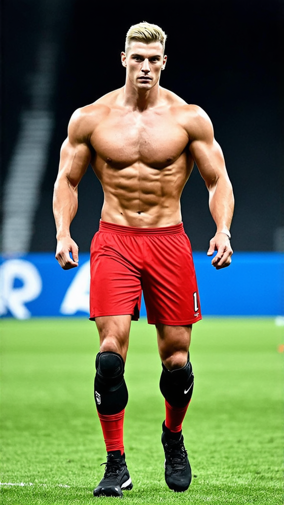 Super-hero, football Player, sports figure, college football. Hypermasculine male, Caucasian white male, young man (about 18 thru 21). Tall, muscular, sinewy, athletic, fit, wide bach and shoulders, broad chest, narrow waist, big thighs and calves. Super fast, can outrun a car, leaves a trail of wind in his wake. Unstoppable, can plow through his opponents on the football field. Handsome, rugged good looks. Light golden blonde very short hair, flat top hairstyle, close on sides and straight spiky on top. Deep set aqua-blue eyes, strong brow and chin, mild soul patch on face. Cleft in chin, cute dimples on face. Black strips under his eyes to reduce glare. Bare chest, shirtless, sweat running down his chest and legs after a hard practice. Black shoulder pads, elbow pads and knee pads on the outside of his body. Bright red shiny football shorts stretched over his bulging crotch, revealing strong powerful thighs and legs. Black cleated football shoes. Usually running, a need for speed. Full body pose.