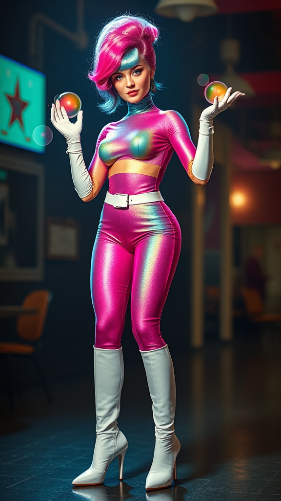 Super-hero from the 60's. Young female, Caucasian woman. Tall, athletic, model type body, Go-Go dancer. Strong, agile, but curvy. Fuchsia colored hair with light blue highlights in a beehive hairdo, long front Bangs lean to one side. Pretty face with long lashes and shimmering rainbow eyes. She wears a form-fitting, one piece spandex bodysuit, shimmering in a rainbow psychedelic pattern. Her outfit is highlighted by white arm-length gloves, a white belt, and white knee-high high heeled Go-Go boots. Full body pose, usually go-go dancing. She can emit multi-colored energy bubbles from her hands, using them as force fields or projectiles.