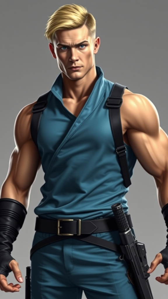 Super-hero, goverment agent, martial artist, works with a super-hero team. Masculine Caucasian male, tall, muscular, lithe but sinewy and strong. Wide shouldered, broad back and chest, slim waist, strong legs. Golden blonde hair, short cut fade with side part, cut close on sides and back, slightly longer on top, conservative hairstyle. Cornflower-blue eyes, strong brow and chisleled jaw. Clean-shaven smooth hairless face. Masculine, handsome, rugged. Outfit consist of a sleeveless vest with sharp shoulders, sky-blue and buttonless fold over style. The back and front of the vest tapers to a pont that falls beneath his waist, a black utility/tactical belt around his waist. Black leather bracers on his strong bare arms. There are two black straps/suspenders attached to the belt; the right side holds a vertical row of shurikens/throwing stars, the left side has a black tanto knife attached to it. On the right side of the belt is his gun holster that carries his. 45 Magnum gun. Form-fitting non-reflective black tights/pants with dark grey knee pads. He wears a pair of sky-blue knee-high folded down bucket boots. He keeps a sai weapon in each one. He has fast reflexes and high dexterity. He is trained to use any and all kinds of weapons. When he's not using weapons, he relies on his fighting skills and strength, being a highly trained martial artist with skills learned all over the world. Full body pose, martial arts stance or firing his gun.
