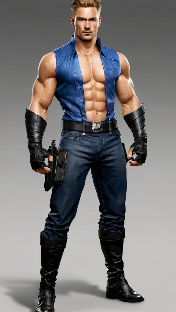Super-hero, goverment agent, martial artist, works with a super-hero team. Masculine Caucasian male, tall, muscular, lithe but sinewy and strong. Wide shouldered, broad back and chest, slim waist, strong legs. Golden blonde hair, short cut fade with side part, cut close on sides and back, slightly longer on top, conservative hairstyle. Cornflower-blue eyes, strong brow and chisleled jaw. Clean-shaven smooth hairless face. Masculine, handsome, rugged. Outfit consist of a sleeveless vest with sharp shoulders, cerulean-blue and buttonless fold over style. The back and front of the vest tapers to a pont that falls beneath his waist, a black utility/tactical belt around his waist. Black leather bracers on his strong bare arms. There are two black straps/suspenders attached to the belt; the right side holds a vertical row of shurikens/throwing stars, the left side has a black tanto knife attached to it. On the right side of the belt is his gun holster that carries his. 45 Magnum gun. Form-fitting non-reflective black tights/pants with dark grey knee pads. He wears a pair of cerulean-blue knee-high folded down bucket boots. He keeps a sai weapon in each one. He has fast reflexes and high dexterity. He is trained to use any and all kinds of weapons. When he's not using weapons, he relies on his fighting skills and strength, being a highly trained martial artist with skills learned all over the world. Full body pose, martial arts stance or firing his gun.