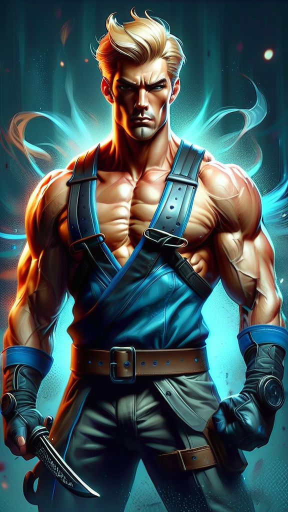 Super-hero, goverment agent, martial artist, works with a super-hero team. Masculine Caucasian male, tall, muscular, lithe but sinewy and strong. Wide shouldered, broad back and chest, slim waist, strong legs. Golden blonde hair, short cut fade with side part, cut close on sides and back, slightly longer on top, conservative hairstyle. Cornflower-blue eyes, strong brow and chisleled jaw. Clean-shaven smooth hairless face. Masculine, handsome, rugged. Outfit consist of a sleeveless vest with sharp shoulders, cerulean-blue and buttonless fold over style. The back and front of the vest tapers to a pont that falls beneath his waist, a black utility/tactical belt around his waist. Black leather bracers on his strong bare arms. There are two black straps/suspenders attached to the belt; the right side holds a vertical row of shurikens/throwing stars, the left side has a black tanto knife attached to it. On the right side of the belt is his gun holster that carries his. 45 Magnum gun. Form-fitting non-reflective black tights/pants with dark grey knee pads. He wears a pair of cerulean-blue knee-high folded down bucket boots. He keeps a sai weapon in each one. He has fast reflexes and high dexterity. He is trained to use any and all kinds of weapons. When he's not using weapons, he relies on his fighting skills and strength, being a highly trained martial artist with skills learned all over the world. Full body pose, martial arts stance or firing his gun.