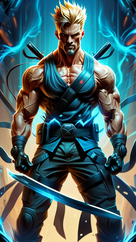 Super-hero, goverment agent, martial artist, works with a super-hero team. Masculine Caucasian male, tall, muscular, lithe but sinewy and strong. Wide shouldered, broad back and chest, slim waist, strong legs. Golden blonde hair, short cut fade with side part, cut close on sides and back, slightly longer on top, conservative hairstyle. Cornflower-blue eyes, strong brow and chisleled jaw. Clean-shaven smooth hairless face. Masculine, handsome, rugged. Outfit consist of a sleeveless vest with sharp shoulders, cerulean-blue and buttonless fold over style. The back and front of the vest tapers to a pont that falls beneath his waist, a black utility/tactical belt around his waist. Black leather bracers on his strong bare arms. There are two black straps/suspenders attached to the belt; the right side holds a vertical row of shurikens/throwing stars, the left side has a black tanto knife attached to it. On the right side of the belt is his gun holster that carries his. 45 Magnum gun. Form-fitting non-reflective black tights/pants with dark grey knee pads. He wears a pair of cerulean-blue knee-high folded down bucket boots. He keeps a sai weapon in each one. He has fast reflexes and high dexterity. He is trained to use any and all kinds of weapons. When he's not using weapons, he relies on his fighting skills and strength, being a highly trained martial artist with skills learned all over the world. Full body pose, martial arts stance or firing his gun.