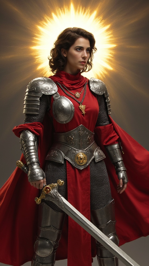 Super-hero, lady Knight, paladin for the 21St century. Feminine Caucasian female, tall, athletic, statuesque, strong, beautiful. Dark brown medium shoulder-length hair, side parted and coily curls. Bluish-grey eyes, kind and intelligent. Silver sun/solar symbol necklace with golden topaz gemstone at the center. A Scarlet red silky shirt, long sleevedand form fitting. A silver pauldron and breastplate on the right side of her body, intricately detailed with solar symbols. Shiny silver bracers on her arms, gauntlets on her hands. A wide silver belt around her waist, a golden topaz gemstone inside a sun symbol as the belt buckle. A wide shiny chainmail loincloth that reaches above the knees. Knee-high silver boots with silver knee pads. She wears a long flowing Scarlet red cape that is clasped at her collarbone. She weilds a gigantic silver battlesword that is carved with delicate solar symbols on the hilt. She is surrounded by a glowing golden aura and a bright halo of light around her head, the light around her head shines like the sun. Not only is she great in battle, she can use holy magic to bless herself or others. She can use this power to heal, repel evil and many other things. She is a representation and living warrior for all that is good. Full body pose, weikding her sword to keep the darkness at bay.