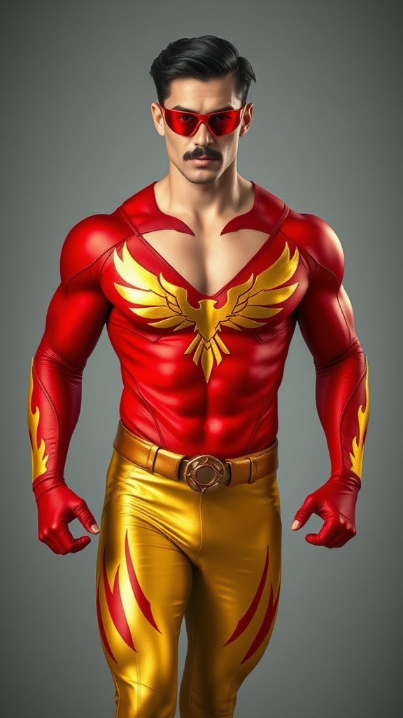 Super-hero, male model, flight and fire. Tall, lithe, slim but muscular. Masculine Caucasian man of French origin. Handsome, model face and body, chiseled jaw and brow, pale blue eyes. Kohl-black hair, cut short on sides and back, longer on top, slicked back. Black chevron mustache, rest of face is smooth and clean shaven. He wears a pair of ruby-red solar shields/sunglasses on his eyes. A red and gold spandex suit, form fitting over a muscular frame. The shirt is red, deep v-cut all the way to his navel, muscle shirt exposing his arms. Cut-outs on the sides of the shirt, partially showing the sides of his torso. A bright metallic gold Hawk symbol spread across the chest of the shirt. Red gloves up to his forearms, yellow-gold flame designs emblazoned up the wrists. A metallic red v-shaped utility belt around his waist. Yellow-gold tights/pants with red flame designs flowing up from the knees. Metallic red knee-high boots with gold flame design accents on the fronts of them. He emits a bright, fiery Hawk shaped aura that emerges during flight. He can blasts flaming fire streams from his hands. Full body pose, in flight and flames on!