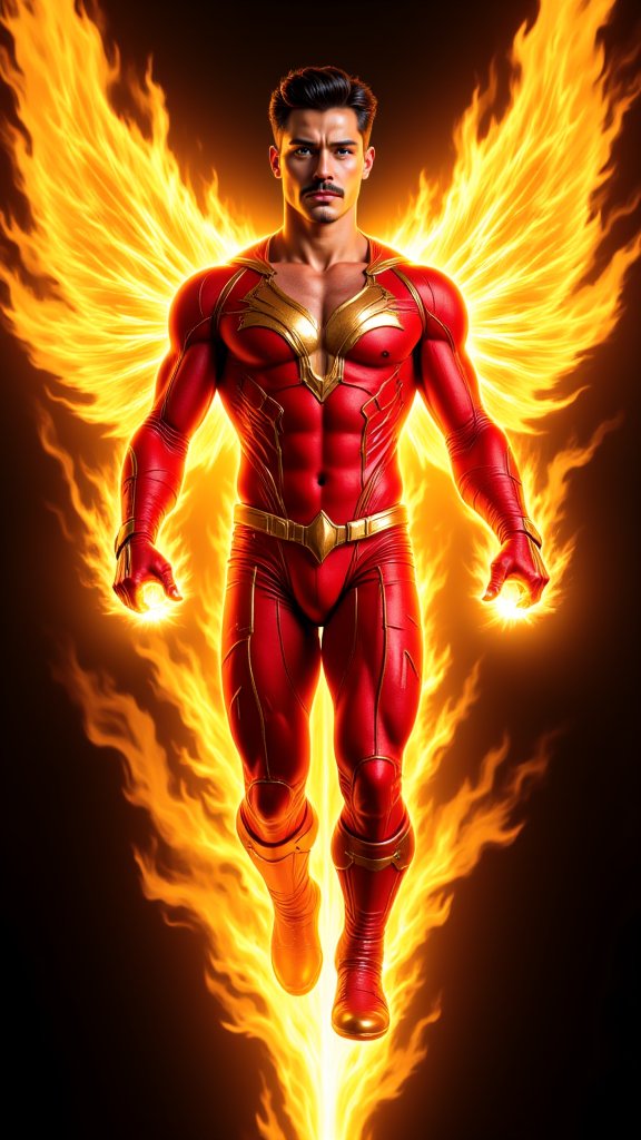 Super-hero, male model, flight and fire. Tall, lithe, slim but muscular. Masculine Caucasian man of French origin. Handsome, model face and body, chiseled jaw and brow, pale blue eyes. Kohl-black hair, cut short on sides and back, longer on top, slicked back. Black chevron mustache, rest of face is smooth and clean shaven. He wears a pair of ruby-red solar shields/sunglasses on his eyes. A red and gold spandex suit, form fitting over a muscular frame. The shirt is red, deep v-cut all the way to his navel, muscle shirt exposing his arms. Cut-outs on the sides of the shirt, partially showing the sides of his torso. A bright metallic gold Hawk symbol spread across the chest of the shirt. Red gloves up to his forearms, yellow-gold flame designs emblazoned up the wrists. A metallic red v-shaped utility belt around his waist. Yellow-gold tights/pants with red flame designs flowing up from the knees. Metallic red knee-high boots with gold flame design accents on the fronts of them. He emits a bright, fiery Hawk shaped aura that emerges during flight. He can blasts flaming fire streams from his hands. Full body pose, in flight and flames on!