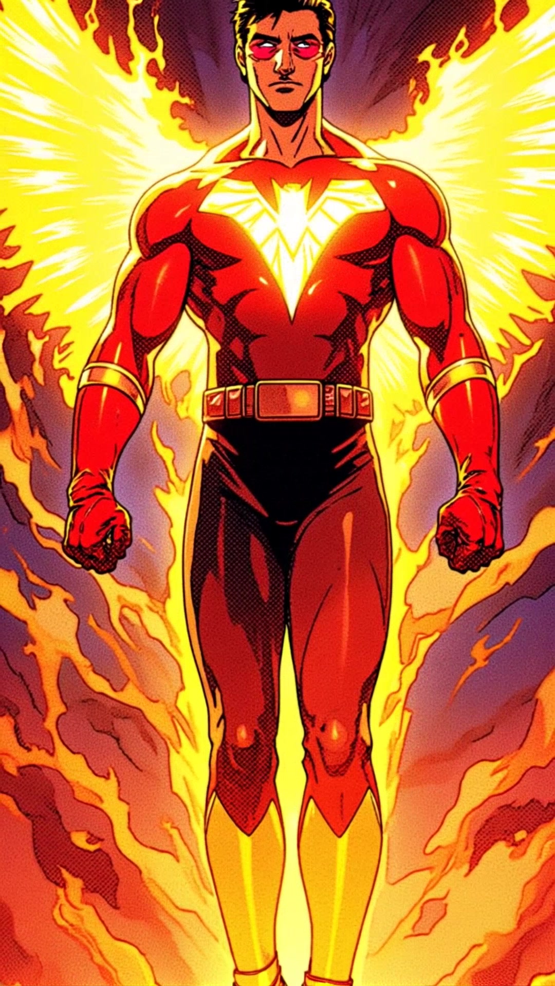 Super-hero, male model, flight and fire. Tall, lithe, slim but muscular. Masculine Caucasian man of French origin. Handsome, model face and body, chiseled jaw and brow, pale blue eyes. Kohl-black hair, cut short on sides and back, longer on top, slicked back. Black chevron mustache, rest of face is smooth and clean shaven. He wears a pair of ruby-red solar shields/sunglasses on his eyes. A red and gold spandex suit, form fitting over a muscular frame. The shirt is red, deep v-cut all the way to his navel, muscle shirt exposing his arms. Cut-outs on the sides of the shirt, partially showing the sides of his torso. A bright metallic gold Hawk symbol spread across the chest of the shirt. Red gloves up to his forearms, yellow-gold flame designs emblazoned up the wrists. A metallic red v-shaped utility belt around his waist. Yellow-gold tights/pants with red flame designs flowing up from the knees. Metallic red knee-high boots with gold flame design accents on the fronts of them. He emits a bright, fiery Hawk shaped aura that emerges during flight. He can blasts flaming fire streams from his hands. Full body pose, in flight and flames on!