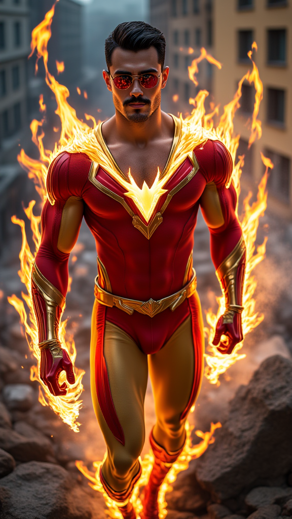 Super-hero, male model, flight and fire. Tall, lithe, slim but muscular. Masculine Caucasian man of French origin. Handsome, model face and body, chiseled jaw and brow, pale blue eyes. Kohl-black hair, cut short on sides and back, longer on top, slicked back. Black chevron mustache, rest of face is smooth and clean shaven. He wears a pair of ruby-red solar shields/sunglasses on his eyes. A red and gold spandex suit, form fitting over a muscular frame. The shirt is red, deep v-cut all the way to his navel, muscle shirt exposing his arms. Cut-outs on the sides of the shirt, partially showing the sides of his torso. A bright metallic gold Hawk symbol spread across the chest of the shirt. Red gloves up to his forearms, yellow-gold flame designs emblazoned up the wrists. A metallic red v-shaped utility belt around his waist. Yellow-gold tights/pants with red flame designs flowing up from the knees. Metallic red knee-high boots with gold flame design accents on the fronts of them. He emits a bright, fiery Hawk shaped aura that emerges during flight. He can blasts flaming fire streams from his hands. Full body pose, in flight and flames on!