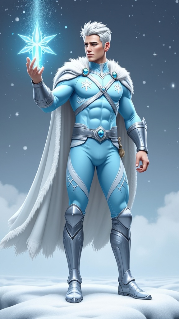 Super-hero. Myth. Ice Elf, King of Winter Magic. Young Caucasian man of Norse heritage (age 18 to 25). Tall, slim, lithe but strong, athletic. Handsome young face with silvery-white short hair (close cut on sides and back, spiky on top with Bangs ). Smooth hairless face, icy blue eyes, pale skin, dimpled cheeks, cute smile.Elf ears. Very pale blue spandex outfit with white snowflake designs on legs and chest. Silver chestplate/armor, silver shoulder pads, silver bracers on arms. Sliver belt with pale blue gemstone around waist. Silver knee-high boots. A short white cape in rhe shape of a swowflake on his back, draped over his shoulder and pinned with a crystal snowflake. He carries a crystal sword that glows pale blue in the presence of anything evil and will blind them with refracted light from its surface. Full body pose, projecting ice shards from his hand.