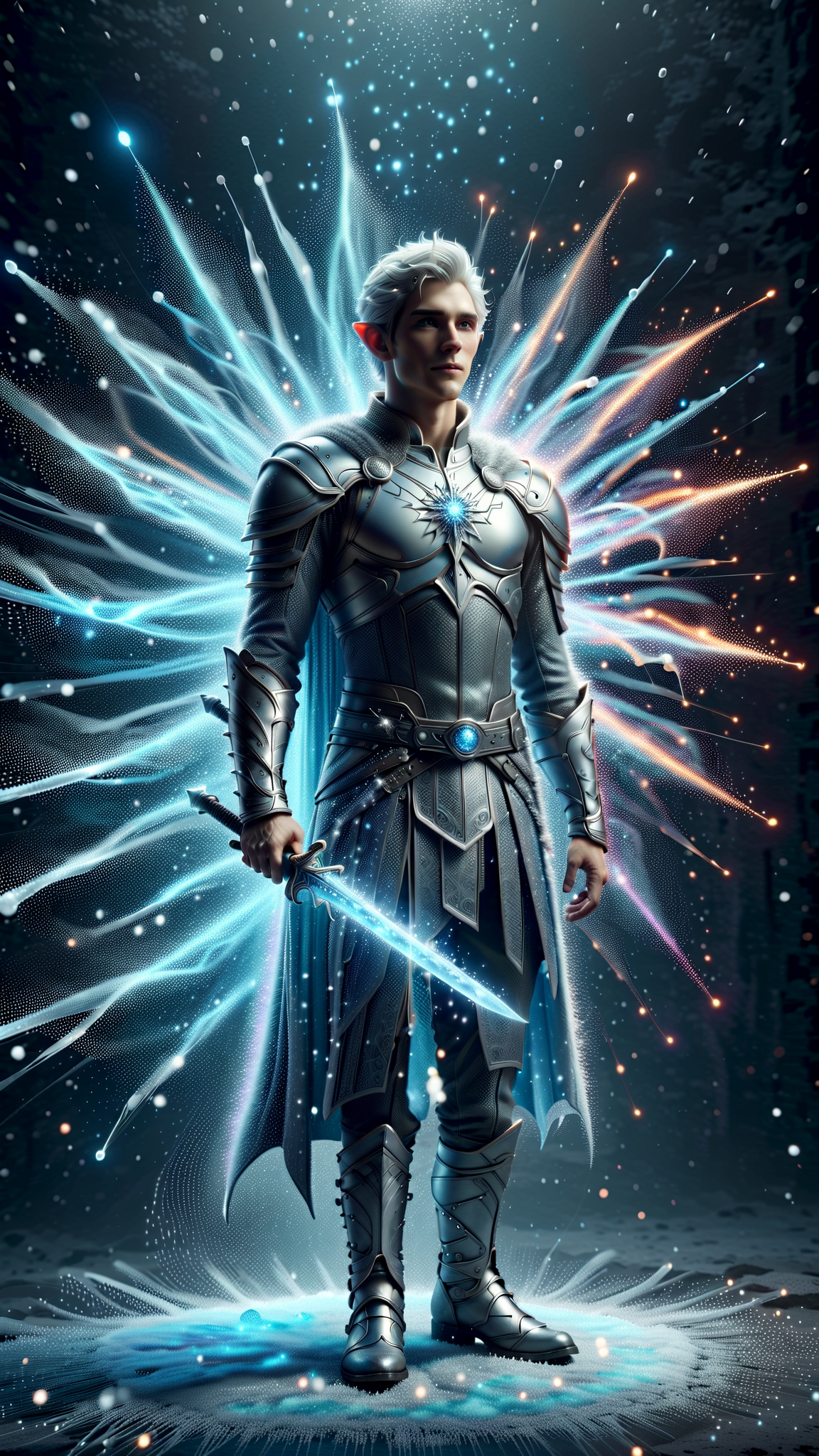 Super-hero. Myth. Ice Elf, King of Winter Magic. Young Caucasian man of Norse heritage (age 18 to 25). Tall, slim, lithe but strong, athletic. Handsome young face with silvery-white short hair (close cut on sides and back, spiky on top with Bangs ). Smooth hairless face, icy blue eyes, pale skin, dimpled cheeks, cute smile.Elf ears. Very pale blue spandex outfit with white snowflake designs on legs and chest. Silver chestplate/armor, silver shoulder pads, silver bracers on arms. Sliver belt with pale blue gemstone around waist. Silver knee-high boots. A short white cape in rhe shape of a swowflake on his back, draped over his shoulder and pinned with a crystal snowflake. He carries a crystal sword that glows pale blue in the presence of anything evil and will blind them with refracted light from its surface. Full body pose, projecting ice shards from his hand.