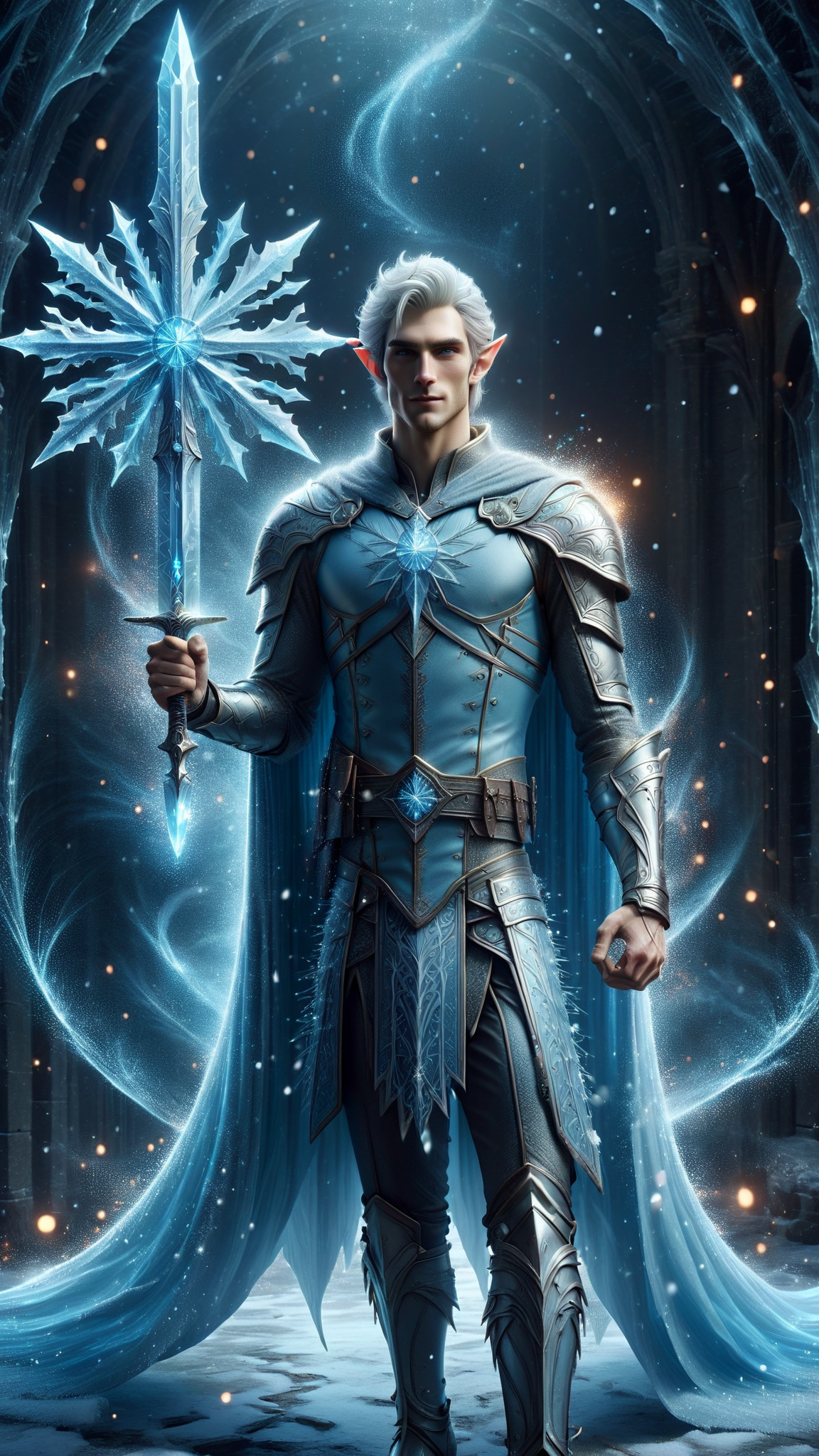 Super-hero. Myth. Ice Elf, King of Winter Magic. Young Caucasian man of Norse heritage (age 18 to 25). Tall, slim, lithe but strong, athletic. Handsome young face with silvery-white short hair (close cut on sides and back, spiky on top with Bangs ). Smooth hairless face, icy blue eyes, pale skin, dimpled cheeks, cute smile.Elf ears. Very pale blue spandex outfit with white snowflake designs on legs and chest. Silver chestplate/armor, silver shoulder pads, silver bracers on arms. Sliver belt with pale blue gemstone around waist. Silver knee-high boots. A short white cape in rhe shape of a swowflake on his back, draped over his shoulder and pinned with a crystal snowflake. He carries a crystal sword that glows pale blue in the presence of anything evil and will blind them with refracted light from its surface. Full body pose, projecting ice shards from his hand.