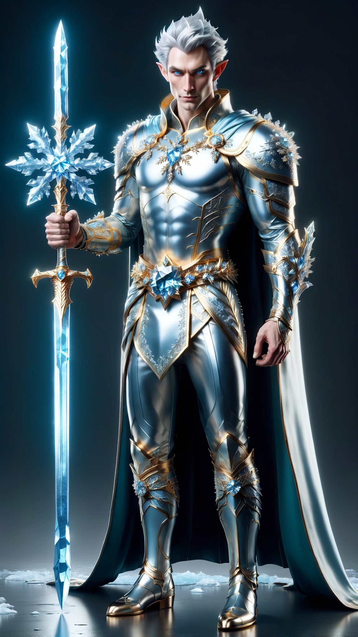 Super-hero. Myth. Ice Elf, King of Winter Magic. Young Caucasian man of Norse heritage (age 18 to 25). Tall, slim, lithe but strong, athletic. Handsome young face with silvery-white short hair (close cut on sides and back, spiky on top with Bangs ). Smooth hairless face, icy blue eyes, pale skin, dimpled cheeks, cute smile.Elf ears. Very pale blue spandex outfit with white snowflake designs on legs and chest. Silver chestplate/armor, silver shoulder pads, silver bracers on arms. Sliver belt with pale blue gemstone around waist. Silver knee-high boots. A short white cape in rhe shape of a swowflake on his back, draped over his shoulder and pinned with a crystal snowflake. He carries a crystal sword that glows pale blue in the presence of anything evil and will blind them with refracted light from its surface. Full body pose, projecting ice shards from his hand.