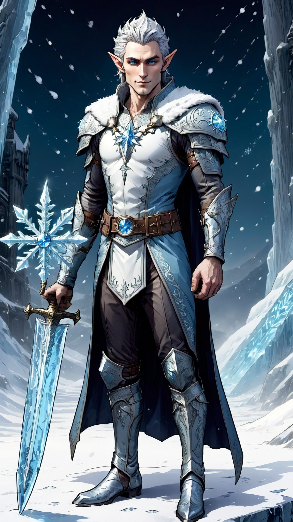 Super-hero. Myth. Ice Elf, King of Winter Magic. Young Caucasian man of Norse heritage (age 18 to 25). Tall, slim, lithe but strong, athletic. Handsome young face with silvery-white short hair (close cut on sides and back, spiky on top with Bangs ). Smooth hairless face, icy blue eyes, pale skin, dimpled cheeks, cute smile.Elf ears. Very pale blue spandex outfit with white snowflake designs on legs and chest. Silver chestplate/armor, silver shoulder pads, silver bracers on arms. Sliver belt with pale blue gemstone around waist. Silver knee-high boots. A short white cape in rhe shape of a swowflake on his back, draped over his shoulder and pinned with a crystal snowflake. He carries a crystal sword that glows pale blue in the presence of anything evil and will blind them with refracted light from its surface. Full body pose, projecting ice shards from his hand.