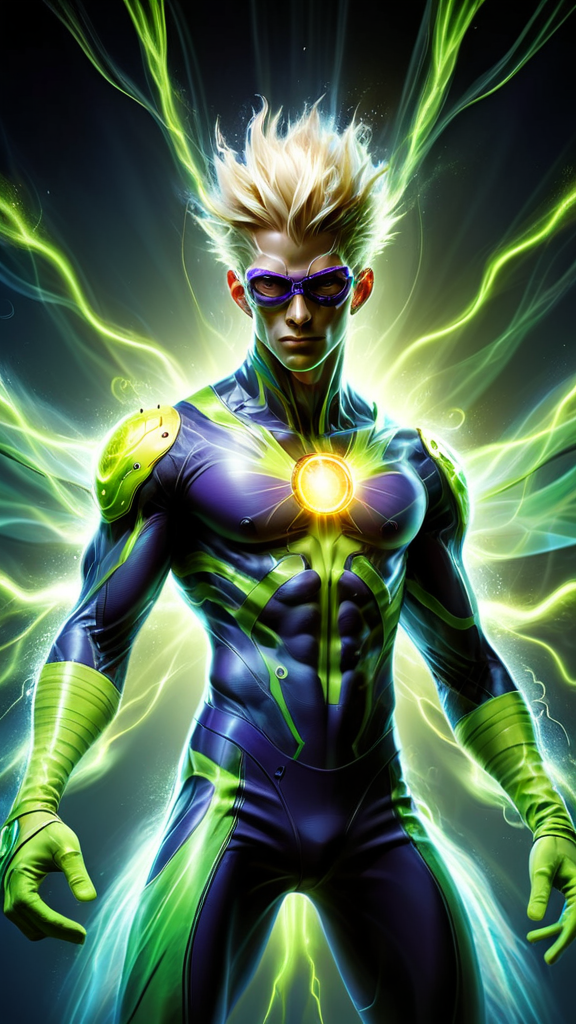 Super-hero, psionic, telepath. A very cerebral hero with mind powers, studious and collegiate. Masculine caucasian male, tall, lanky, lithe but sinewy and well defined. Short blonde hair, straight fade hairstyle short on sides and back, longer on top. Blue eyes, but usually hidden behind a pair of chartreuse green color goggles. Smooth hairless face, clean shaven. One-piece full spandex outfit/uniform; the top part is eggplant-purple color across the shoulders and down the torso. It goes all the way up his head, but the face and eyes are exposed, as well as his hair. There is a thin chartreuse green stripe down each shoulder and side of his torso, joining into a pair of bright chartreuse green gloves that start at his hands and go all the way to the top of his biceps. His chartreuse green thigh-high boots meet the stripes on the sides of his torso--- everything blends seamlessly to look like a solid piece uniform. There is a stylized chartreuse graphic jagged line across his chest, meant to resemble a moving brainwave. There is a bright yellow-green starburst glow coming from his head, this is his brainpower at work. He has telepathy, telekinetics, as well as other mind powers. He can use his telekinesis to fly for short distances. Full body pose, flying through the streets. His solar goggles and head are bright with yellow-green light, brain waves sparking around his head.