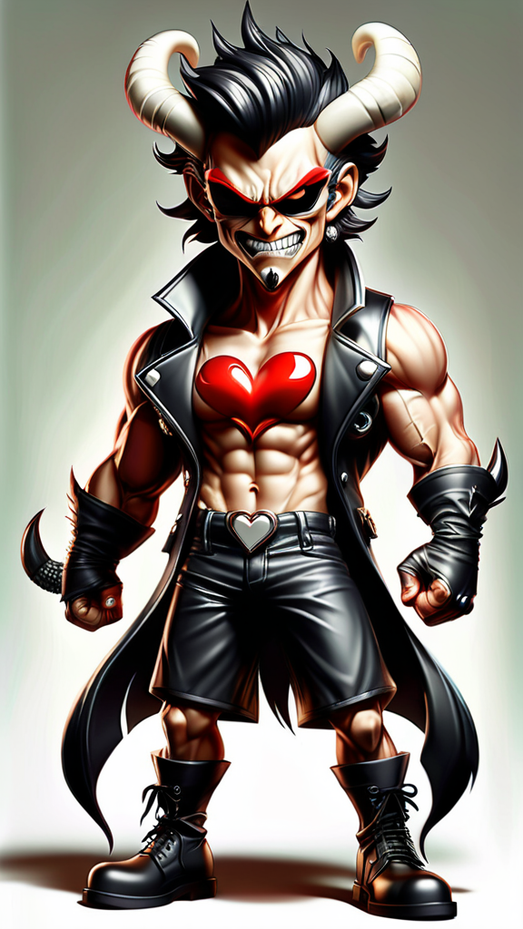 Super-hero. Sex symbol. DEMON?!!! He used to be a bad guy, now he fights the good fight against evil! He's part of a super-hero team, and he brings the rage and the beat-down when neccessary--- but he's so cute while doing it, and all the girls just love him! Medium height but muscular, sinewy, well defined, lithe. Masculine Caucasian male, handsome and cute. Hairless face other than soul-patch. Black curly hair in a tight faux-hawk, shaved on the sides and back, curly up top. Pointed ears. Sometimes during battle or an angry moment, a small pair of ivory white horns will pop out of his temples. His eyes glow red, but they're usually behind a pair of dark sunglasses. His fangs only show if he's angry or smiling-- he usually smiling and winking at some cute girl. He has retractable claws, they only pop out during battle. He prefers to wear muscle crop-top shirts to show off his abs, and really form-fitting pants to show off "other things". A pair of black leather combat boots on his feet. He wears a black trenchcoat with the sleeves cut off, open to reveal his outfit. He has a prehensile tail with a heart shaped tip, he usually keeps that hidden under the trenchcoat unless he's in battle or teasing some cute girl. He loves all the flirting and great PR he gets with his group. Full body pose, probably winking and smiling at some cute girl! {{{Prehensile tail with heart shaped tip}}}
