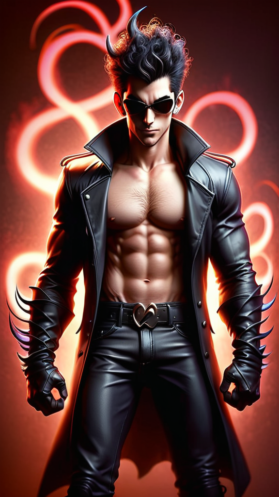 Super-hero. Sex symbol. DEMON?!!! He used to be a bad guy, now he fights the good fight against evil! He's part of a super-hero team, and he brings the rage and the beat-down when neccessary--- but he's so cute while doing it, and all the girls just love him! Medium height but muscular, sinewy, well defined, lithe. Masculine Caucasian male, handsome and cute. Hairless face other than soul-patch. Black curly hair in a tight faux-hawk, shaved on the sides and back, curly up top. Pointed ears. Sometimes during battle or an angry moment, a small pair of ivory white horns will pop out of his temples. His eyes glow red, but they're usually behind a pair of dark sunglasses. His fangs only show if he's angry or smiling-- he usually smiling and winking at some cute girl. He has retractable claws, they only pop out during battle. He prefers to wear muscle crop-top shirts to show off his abs, and really form-fitting pants to show off "other things". A pair of black leather combat boots on his feet. He wears a black trenchcoat with the sleeves cut off, open to reveal his outfit. He has a prehensile tail with a heart shaped tip, he usually keeps that hidden under the trenchcoat unless he's in battle or teasing some cute girl. He loves all the flirting and great PR he gets with his group. Full body pose, probably winking and smiling at some cute girl! {{{Prehensile tail with heart shaped tip}}}