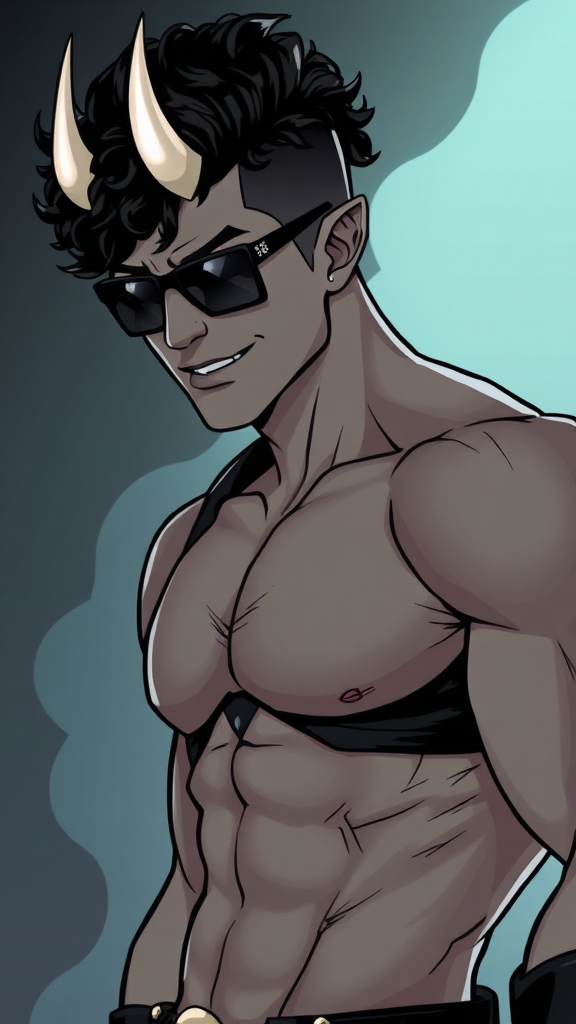 Super-hero. Sex symbol. DEMON?!!! He used to be a bad guy, now he fights the good fight against evil! He's part of a super-hero team, and he brings the rage and the beat-down when neccessary--- but he's so cute while doing it, and all the girls just love him! Medium height but muscular, sinewy, well defined, lithe. Masculine Caucasian male, handsome and cute. Hairless face other than soul-patch. Black curly hair in a tight faux-hawk, shaved on the sides and back, curly up top. Pointed ears. Sometimes during battle or an angry moment, a small pair of ivory white horns will pop out of his temples. His eyes glow red, but they're usually behind a pair of dark sunglasses. His fangs only show if he's angry or smiling-- he usually smiling and winking at some cute girl. He has retractable claws, they only pop out during battle. He prefers to wear muscle crop-top shirts to show off his abs, and really form-fitting pants to show off "other things". A pair of black leather combat boots on his feet. He wears a black trenchcoat with the sleeves cut off, open to reveal his outfit. He has a prehensile tail with a heart shaped tip, he usually keeps that hidden under the trenchcoat unless he's in battle or teasing some cute girl. He loves all the flirting and great PR he gets with his group. Full body pose, probably winking and smiling at some cute girl! {{{Prehensile tail with heart shaped tip}}}