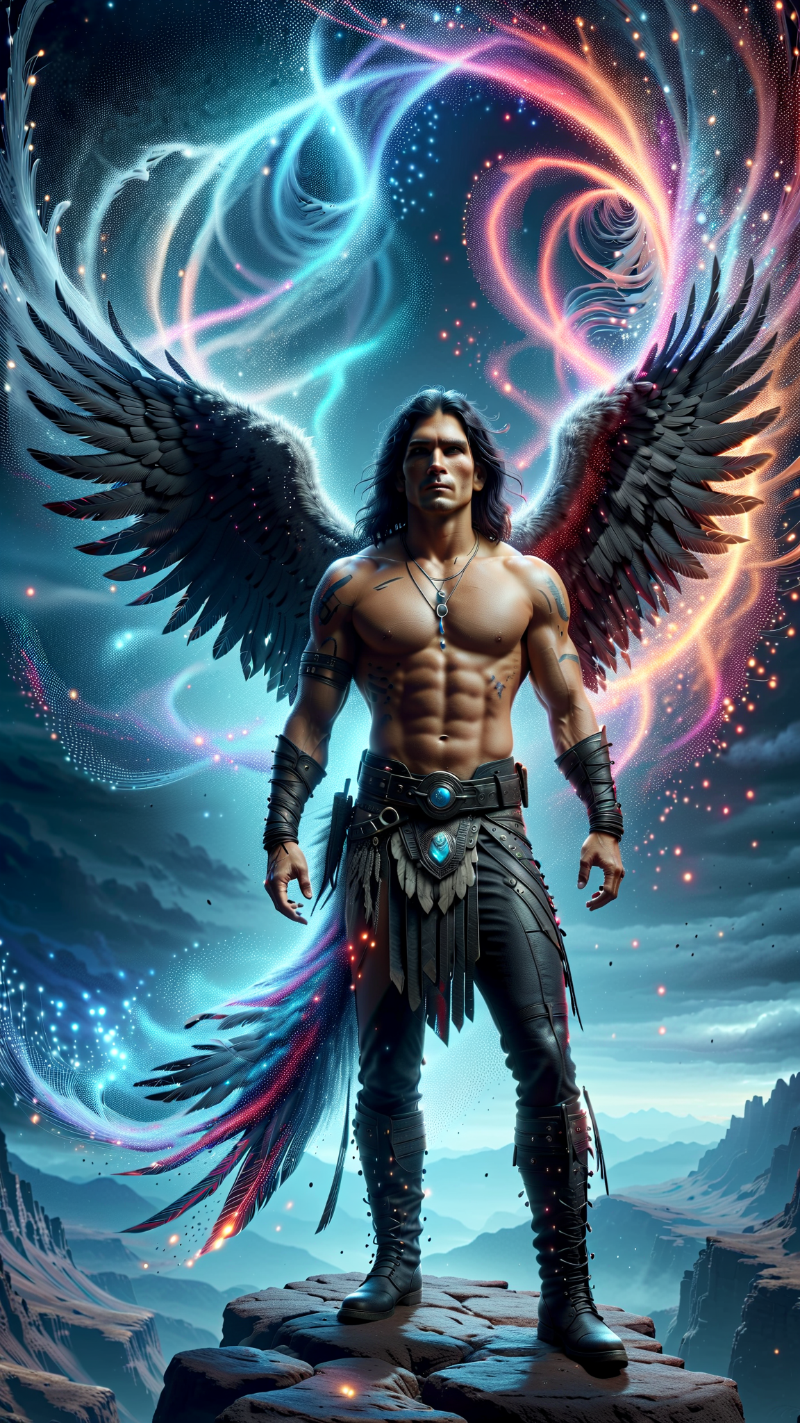Super-hero, shaman, mystic warrior. Male Native American/Indian man. Young and proud super-hero.He can fly with his hawk-like wings. He also controls the weather, heals people, and has contact with the Great Spirit. Tall, muscular, sinewy, broad chest, strong. Handsome, high cheekbones, strong jaw. Dark eyes, intense and spiritual. Red and blue warpaint on face. Jet-black hair medium length bob, hangs slightly over eyes. Bare chested, minimal body hair. Red, blue and black Hawk tattoo on chest. Blue swirly pattern tattoos on arms, shoulders and parts of the torso. Azure blue tights with white swirly patterns. Black bracers on arms. Soft, slouchy knee-high black boots. Long black sash-belt around waist, magic medicine bag attached. Huge grey and black Angel wings on his back, unfolded and spread out, the colors of a Hawk. Misty-bluish aura, magical. Full body pose, flying in air. He watches over the land and all the people in it.