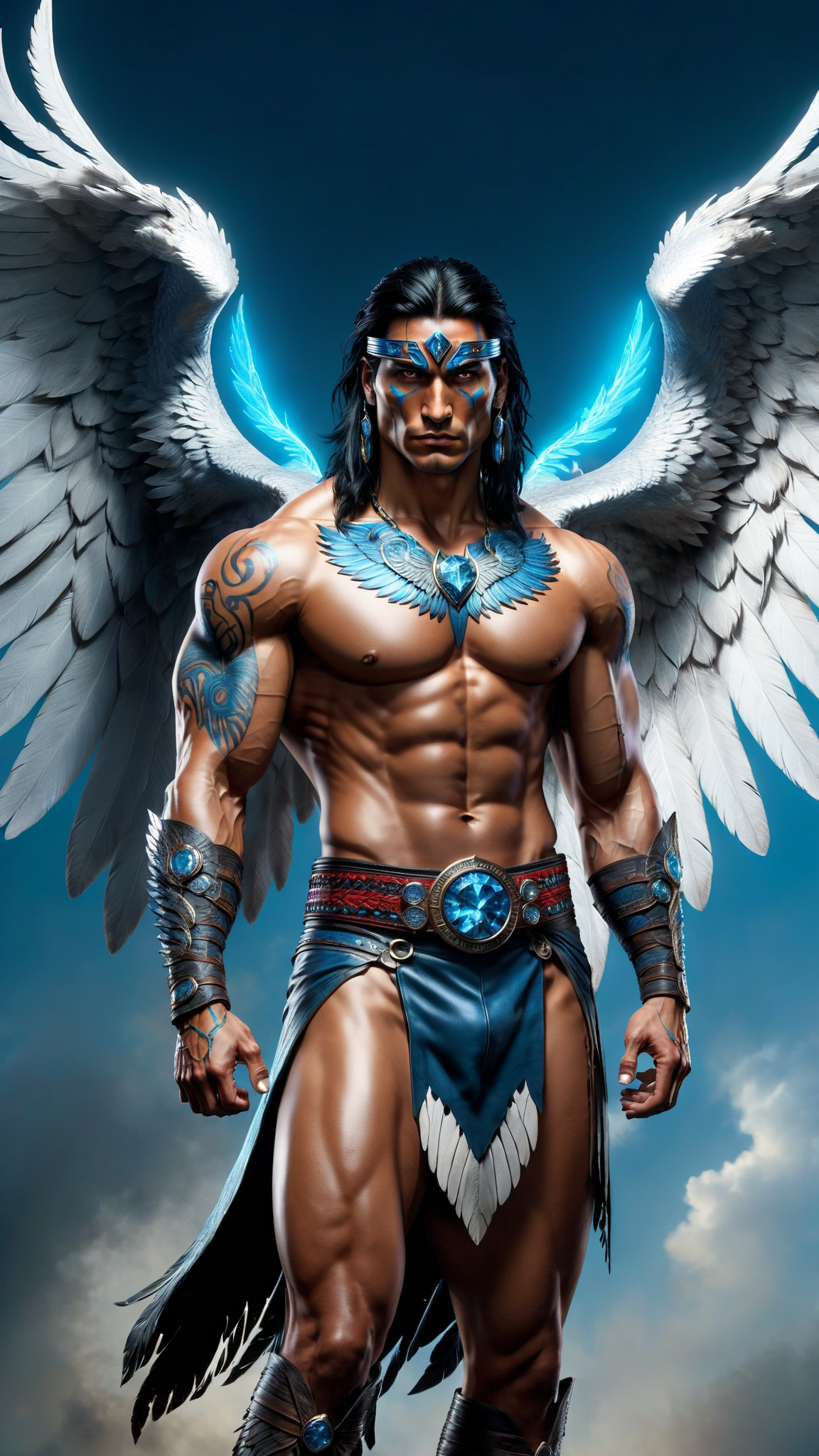 Super-hero, shaman, mystic warrior. Male Native American/Indian man. Young and proud super-hero.He can fly with his hawk-like wings. He also controls the weather, heals people, and has contact with the Great Spirit. Tall, muscular, sinewy, broad chest, strong. Handsome, high cheekbones, strong jaw. Dark eyes, intense and spiritual. Red and blue warpaint on face. Jet-black hair medium length bob, hangs slightly over eyes. Bare chested, minimal body hair. Red, blue and black Hawk tattoo on chest. Blue swirly pattern tattoos on arms, shoulders and parts of the torso. Azure blue tights with white swirly patterns. Black bracers on arms. Soft, slouchy knee-high black boots. Long black sash-belt around waist, magic medicine bag attached. Huge grey and black Angel wings on his back, unfolded and spread out, the colors of a Hawk. Misty-bluish aura, magical. Full body pose, flying in air. He watches over the land and all the people in it.