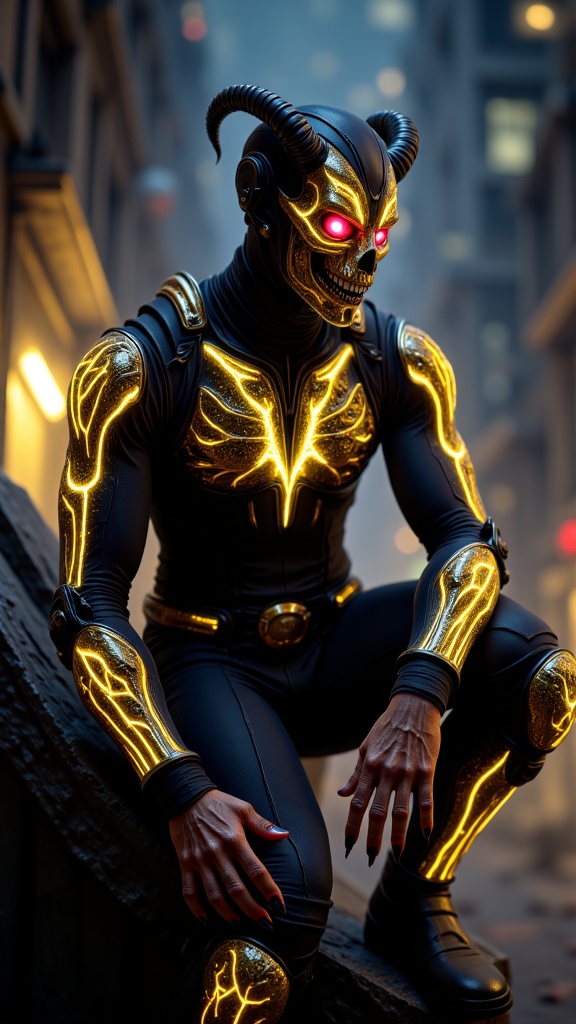 Super-hero, vigilante anti-hero, spooky. cinematic composition, urban noir atmosphere. Athletic Caucasian male, muscular husky build, 5'10", wearing a formfit spandex tactical stealth suit in matte black nano-fabric. Ornate yellow-gold skeleton graphic design overlay across limbs, anatomically accurate bone patterns with glow-in-the dark. Yellow-gold combat boots rising to knees with aggressive V-cutout, deep crimson titanium toe caps. Armored gauntlets in metallic yellow-gold reaching elbows, featuring crimson finger-tips with retractable diamond-tipped claws. Custom electroshock weapon system generating vivid red lightning effects, 32k resolution electricity details. Chest armor features intimidating demon-face design: yellow-gold base with cut-out revealing matte black underlayer forming ribs, centered by menacing grin with sharp blood-red metal teeth. Upper chest includes glowing crimson LED eye shapes, shoulders sculpted into sharp horn-like points. Tactical neck guard in stealth black nanoweave, flowing into yellow-gold face mask with aggressive V-shape design. Mask features geometric black jaw section and prominent crimson V-shaped visor with internal illumination, creating threatening eyes effect. Modern short fade hairstyle with dark brown top length styled sideswept. Dynamic pose showing figure perched on gothic architecture, photographed from dramatic low angle. Moody nighttime urban setting with neon accent lighting, volumetric fog effects. Ray-traced reflections on metallic elements, cinematic color grading emphasizing deep shadows and selective highlights. Photorealistic materials and textures, 8k resolution, octane render, ultra-detailed, studio lighting with practical effects.