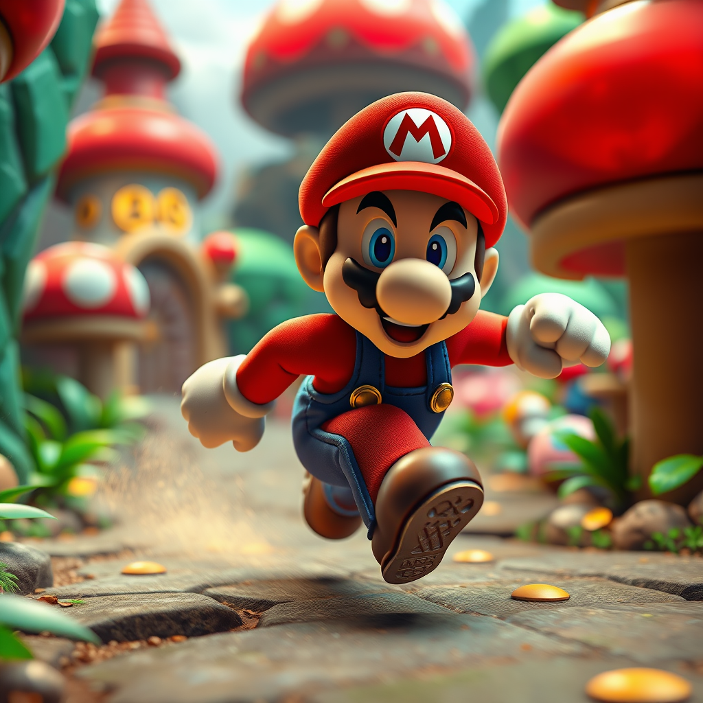 Super-Mario dashing through a vibrant Mushroom Kingdom setting, highly detailed, intricate textures and lighting effects, trending in ultra-realistic 3D rendering, game-inspired style, enhanced background details, aspect ratio of 2:3, sharpness at a premium level, minor creative twists such as dynamic motion effects and subtle atmospheric elements.