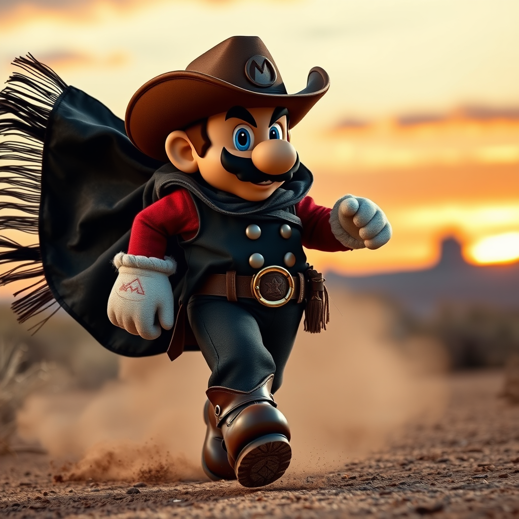 Super Mario dons a rugged cowboy outfit reminiscent of Red Dead Redemption's wild west style, complete with a well-worn poncho draped over his shoulder, a wide-brimmed cowboy hat atop his head, and sturdy leather boots kicking up dust as he strides forward. His black coat billows in the wind as he moves, capturing a classic motion picture shot with a sunset-hued backdrop, evoking the spirit of adventure and frontier landscapes. Mario's iconic mustache is accentuated by a determined gaze, and his attire reflects the blend of video game heroism and gritty western flair. The scene is alive with the essence of the untamed wild west, adding a playful yet bold twist to the classic character.