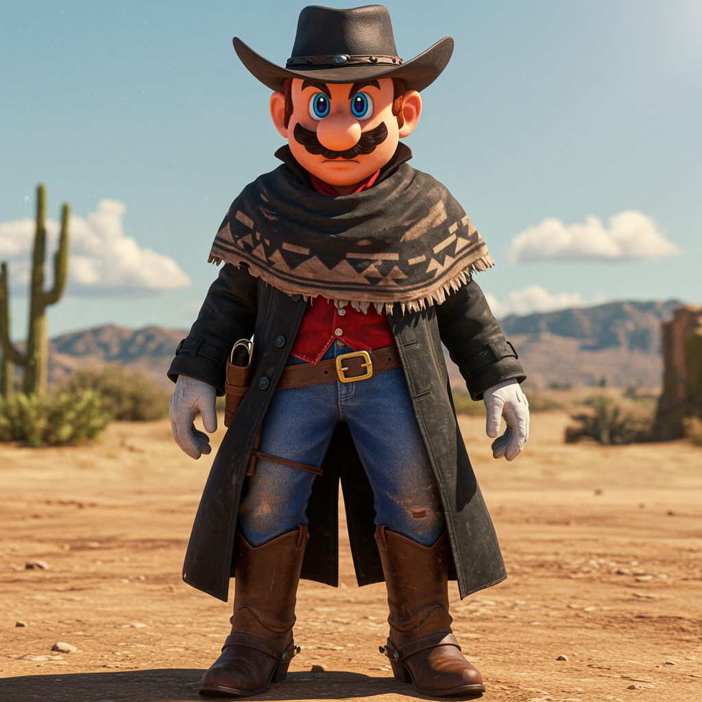 Super Mario dons a rugged cowboy outfit reminiscent of Red Dead Redemption, complete with a worn poncho draped over his shoulders, a wide-brimmed cowboy hat perched atop his head, and sturdy leather boots. His ensemble is complemented by a weathered black trench coat billowing in the wind of the wild west. This cinematic scene captures Mario's determined expression as he stands poised for action against a sunlit desert backdrop, embodying the essence of a classic western hero.