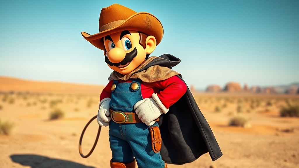 Super Mario, dressed as a rugged cowboy from the Wild West, sports a weathered poncho draped over his classic red shirt and blue overalls. His wide-brimmed cowboy hat, tipped low, shadows his determined eyes. Worn leather boots kick up dust, paired with a long, flowing black coat that billows in the desert breeze. The landscape behind him stretches into a vast frontier, capturing the essence of a motion picture shot. Mario's mustache twitches in the dry air, and a lasso hangs at his side, adding to his adventurous cowboy look.