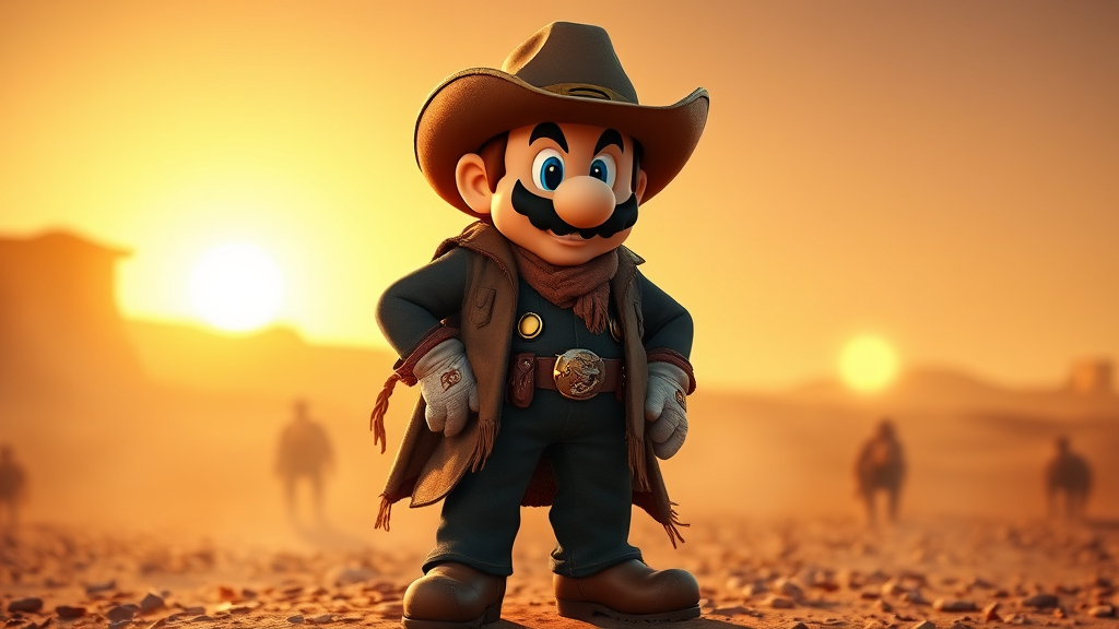 Super Mario in a rugged cowboy ensemble inspired by Red Dead Redemption, featuring a weathered poncho, wide-brimmed cowboy hat, worn leather boots, and a classic black duster coat, exuding an authentic wild west aura. Mario stands confidently, striking a dynamic pose like a scene from a motion picture, with the dusty frontier landscape stretching out behind him as the golden sun sets on the horizon. His iconic mustache adds a touch of whimsical charm to his rough-and-tumble cowboy persona.