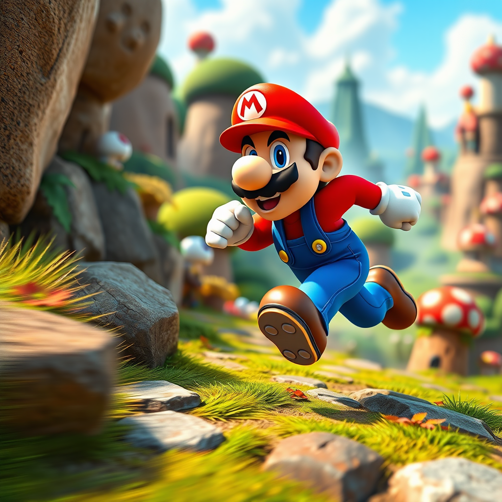 Super-Mario sprinting energetically through the vibrant landscapes of the Mushroom Kingdom, detailed and richly colored background, 32k resolution, dynamic closeup, capturing the essence of a trending 3D game on poltcount, style version 5.2, with a vertical aspect ratio, enhanced sharpness and vibrant colors, rendering quality set to high.