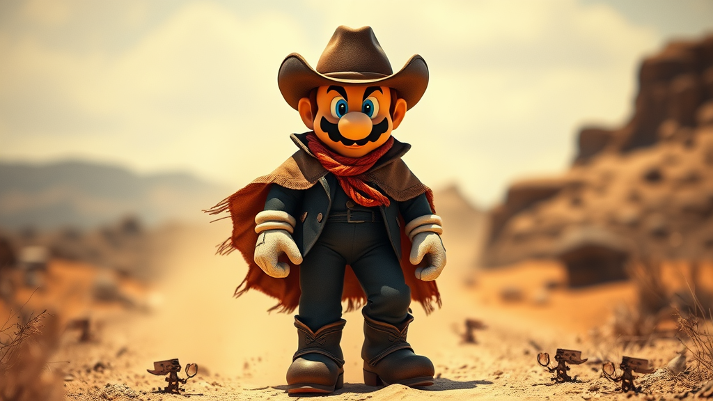 Super Mario transformed into a Wild West gunslinger, sporting a rugged cowboy look. He wears a tattered poncho draped over a sleek black coat, adding an air of mystery. His wide-brimmed cowboy hat casts a shadow over his familiar face, while his sturdy boots kick up dust with each step. The scene captures the essence of a motion picture shot, as Mario stands confidently in the Wild West landscape, embodying the spirit of a fearless adventurer in a Spaghetti Western setting.