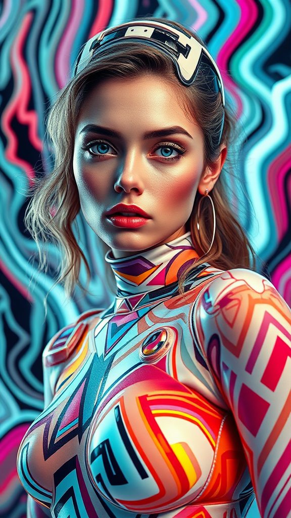 Super realistic full body fashion photoshoot featuring a stunning model in an abstract digital art style. The model's eyes are open, embodying a fusion of white DMT-inspired pop art with vray tracing effects. Zigzags and bold patterns envelop the scene, showcasing elegant and emotive poses that blend with a hint of robotic expressionism. The overall composition boasts a vibrant interplay of colors and textures, creating a captivating and surreal visual experience.