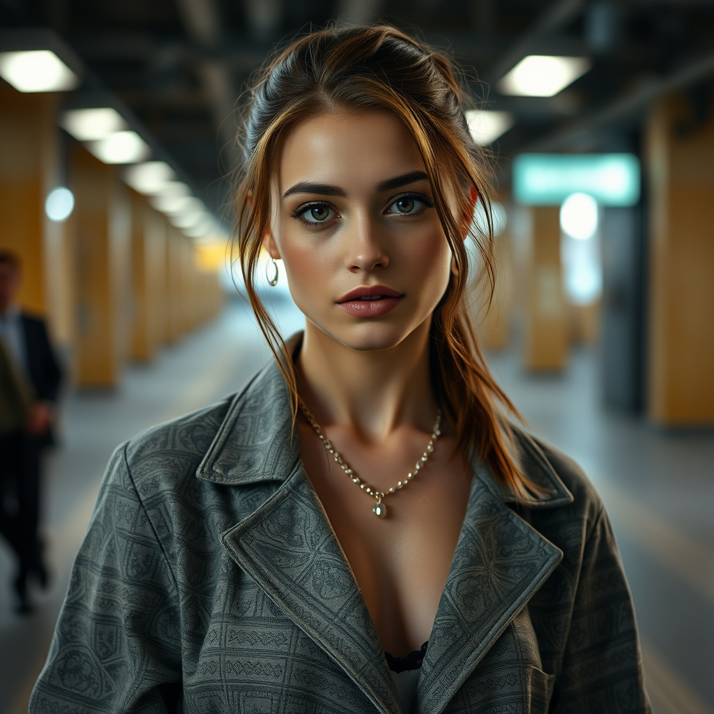 Super-realistic portrait of Nataliya Aleksandrov at a photoshoot location wearing a chic casual outfit with intricate textures, set in cinematic lighting with refined accent highlights, captured with a 35mm lens, showcasing a striking presence with her head just outside the frame. The composition avoids undesirable qualities such as poor resolution, unattractive features, distortion, and unnatural lighting, presenting a beautifully crafted and engaging image.