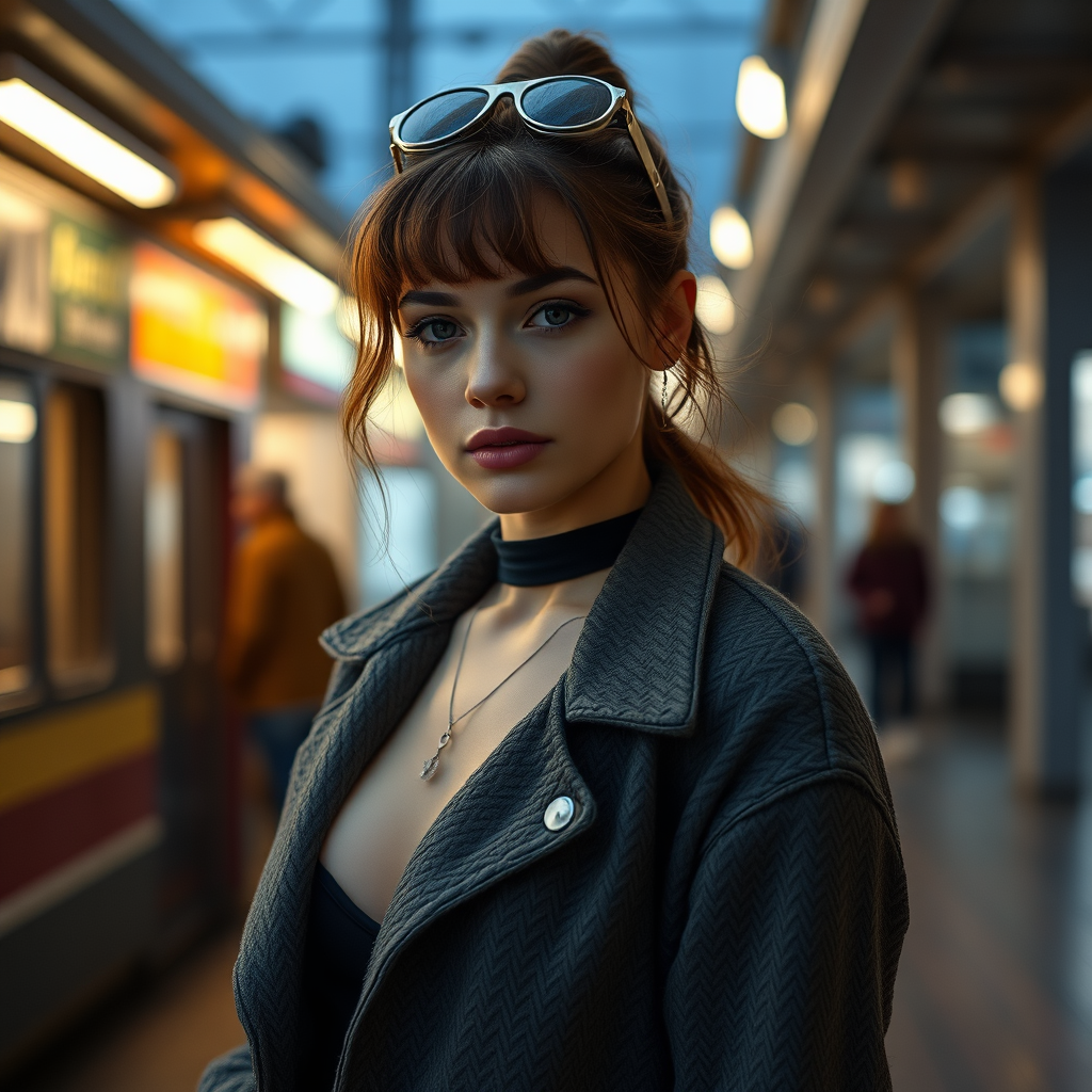 Super-realistic portrait of Nataliya Aleksandrov at a photoshoot location, wearing a highly detailed textured chic casual outfit, under cinematic and accent lighting, captured with a 35mm lens, with her head beautifully framed within the shot.