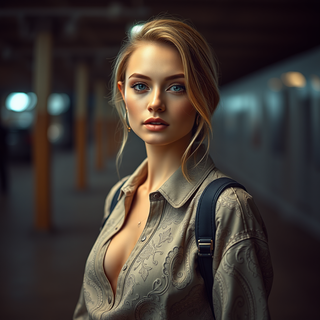 Super-Realistic portrait of Nataliya Aleksandrov standing at a photoshoot location, wearing a chic casual outfit with intricate textures, captured with cinematic lighting and accent lighting, using a 35mm lens. The composition features her head just outside the frame, enhancing the artistic allure. Despite the setting, the image maintains high resolution and exceptional quality, with well-defined and artistically rendered features throughout.
