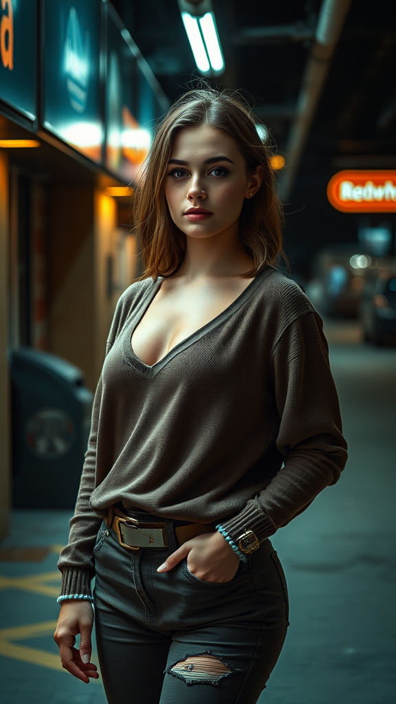 Super-realistic portrait of Nataliya Aleksandrov standing at a photoshoot location, wearing a chic casual outfit with detailed textures, highlighted by cinematic and accent lighting, captured with a 35mm lens. The scene captures her beauty, with her head elegantly positioned just outside the frame. Despite the surrounding imperfections like low resolution and poorly drawn elements, the focus remains on her graceful presence amidst the artistic chaos.