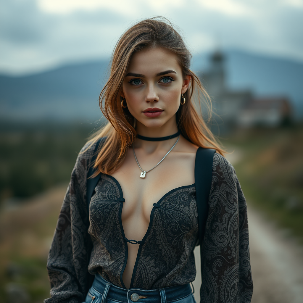 Super-Realistic portrait of Nataliya Aleksandrov standing at a photoshoot location, wearing a chic casual outfit with intricate textures, captured with cinematic lighting and accent highlights, using a 35mm lens; her head framed beautifully just outside the edge. Gentle, artistic modifications enhance the setting, while maintaining an overall natural aesthetic.